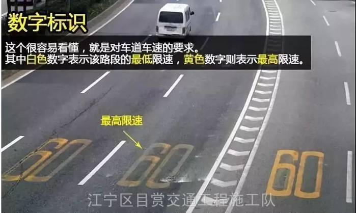 道路上的数字标示比较常见,一般是对车辆车速提出的要求。白色数字表示Z低限速,黄色数字表示Z高限速。
