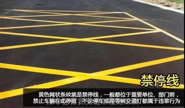 禁停线是黄S网状条纹,一般设置在重要的部门、学校等地方,禁止车辆在此停留,不管是临时停车还是等红绿灯都不可以停留。