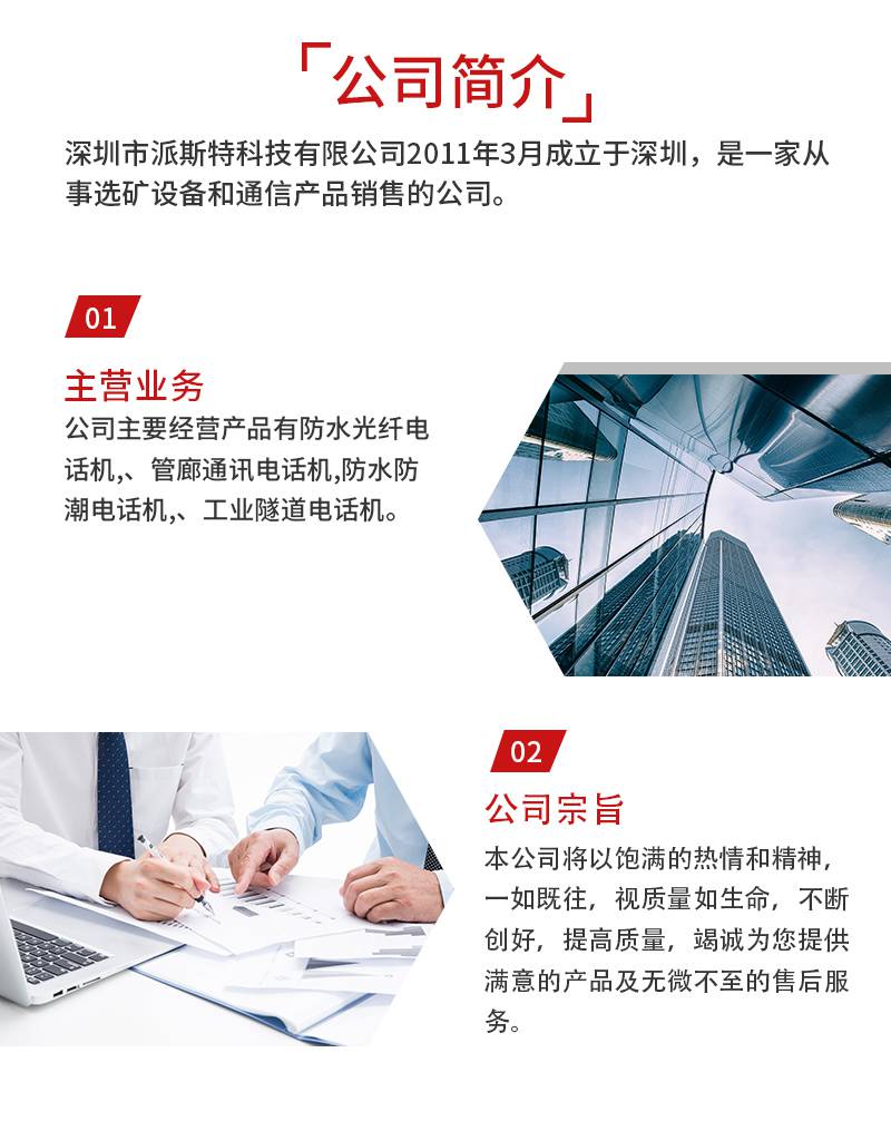 深圳市派斯特科技有限公司是致力于提供紧急通信整套解决方案的供应商,专注于光纤通信、无线通信和应急通信与指挥系统三大领域,产品包括电梯应急求助系统、高速公路电话求助系统、区域应急通信指挥系统等三大系列。 我们凭借多年的技术积累,为企事业用户提供***的通信系统和服务,为用户提供从系统设计、生产、技术支持、到工程安装、售后服务等成体系的服务。 我们的核心价值观“诚信为本、创新为魂、责任为基”。 我们坚持“质量、信誉至上、顾客满意、持续创新”的服务宗旨。 作为一个以技术为先导的高科技企业,在发展壮大的过程中,造就了一支高素质、富有活力和创造性的员工队伍,在通信、电子和计算机软硬件领域的各类型技术专家,确保我们的产品一直处于***前沿。 多年的兢兢业业,我们的几千家用户遍布大江南北,广泛分布在电力、地铁、安防、酒店、金融、公安、卫生、水利、院校、铁路、***等多个领域。我们的产品还远销亚洲、欧洲、非洲和南美。我们提供的通信系统,在载人航天工程、***通信、人防自动化指挥、城市应急指挥、城市轨道交通通信等重大工程项目中,发挥着重要作用。 我们紧跟时代的脉搏,站在技术创新的浪尖,以提供***的通信手段为愿景,运用通信领域的专业经验,不断为您提供***的绿色通信解决方案,和您一道,创造的社会、经济和环境效益。