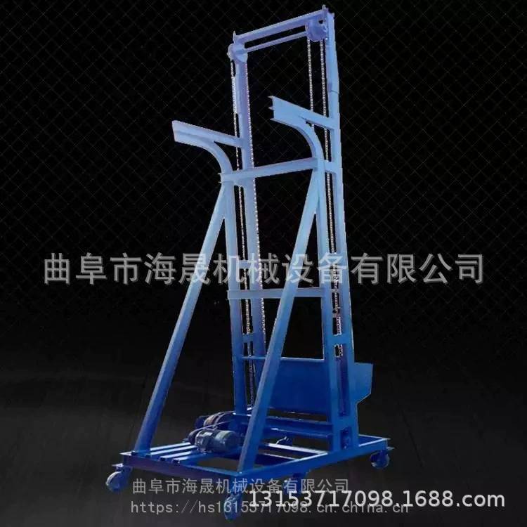 该机由带走轮的料车、传动装置、导轨及滑轮等组成,其工作原理如下:;当料车在底部原始位置时,由人工或其他方式给料车加满物料,料车充满后,按动启动按钮,传动装置的钢丝绳牵引料车缓缓上升,料车沿着导轨上升到***高度的运料层后,***对车轮沿下轨水平段、后一对车轮沿上轨倾斜段继续上升并慢慢翘起、使料车斗体倾翻而卸出物料。在此同时,料车碰触到限位开关,传动装置随即停止工作。确保物料卸清后,按下降按钮,料车即自动返回。当料车自上而下返回到进料处时,碰到底部限位开关,传动装置停止工作。如此上下升降而达到提升物料目的。