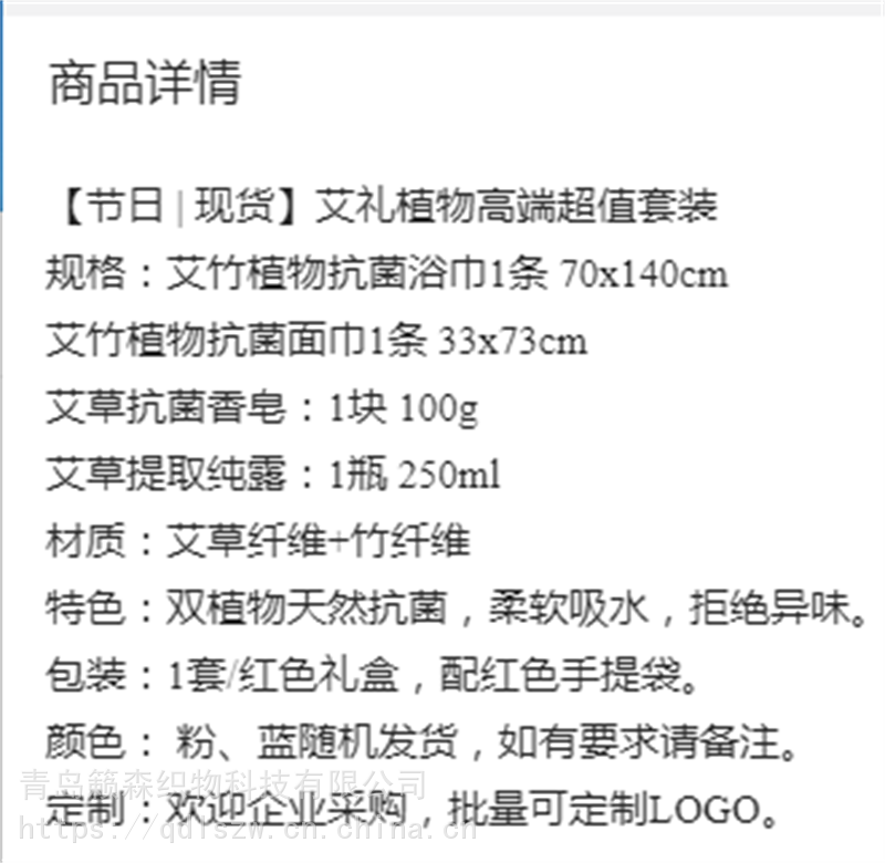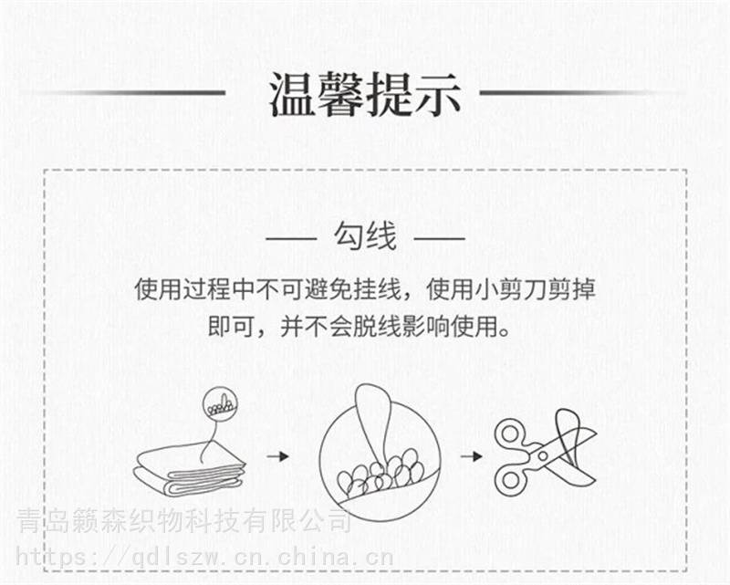 青岛籁森织物科技有限公司,位于百年纺织名城、海滨时尚之都青岛。得益于世界***的纺织设备以及日本高端纺织技术的支持,是国内少有的以毛巾礼品定制为特色研发领域的纺织科技企业。 籁森织物团队拥有为全球***企业定制的经验,拥有20余年的毛巾出口定制优势,拥有服务于国际市场的专业设计师团队,同时拥有经过第三方***检验机构认证的品质保障。 籁森--LTTSON,源于英文Listen To The Sound Of Nature:倾听大自然的天籁之音,包含着让产品回归本色、让合作回归真诚、让心灵回归自然的深层含义。 籁森织物专注于毛巾礼品定制,为全球大中型企事业单位和商业机构提供定制方案,拥有一套科学完善的定制服务系统。“礼品毛巾、***籁森”,成为体验过籁森定制服务的所有客户的心声。
