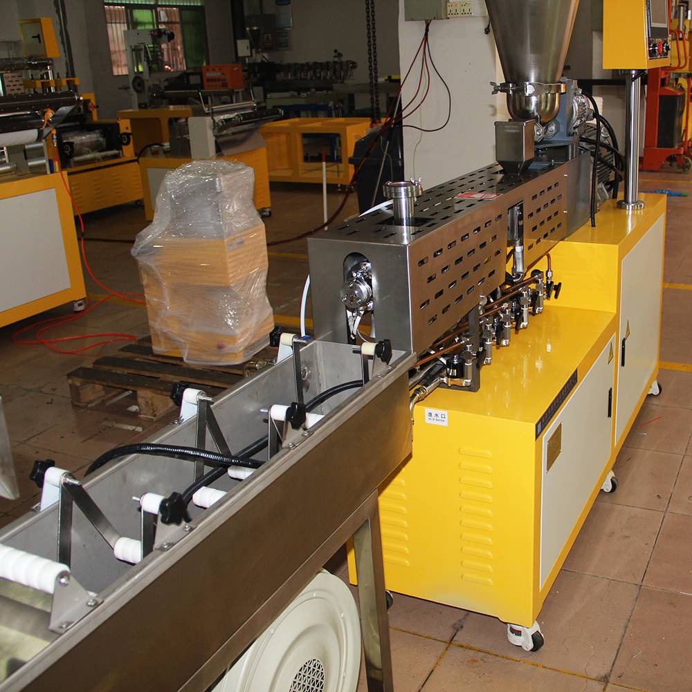 工作原理:本机通过加热、混合,剪切、塑化、压实排气作用下,物料塑化成均匀的熔体,并在双螺杆的挤压下,通过机头挤出圆形的条状料,经冷却水槽水冷后或者风冷后,再经切粒机切粒,得到塑胶粒料。