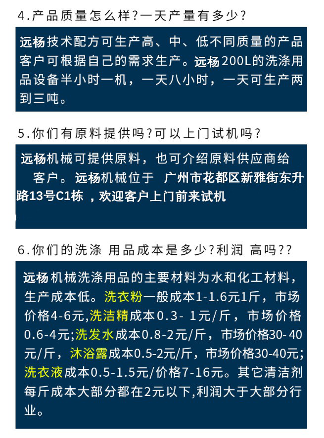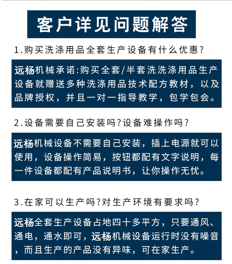 广州远杨机械设备有限公司生产洗发水,沐浴露,洗洁精等洗涤用品生产设备,所有设备 都具有三级水处理及高剪切乳化功能,产品被检测中心***为“检测产品”,设备 3680 元起,而且公司免费提供配方和技术。先学技术后购机,终身享受 新研发技术,设备一年包换,终身维护。
