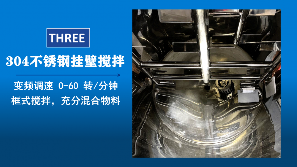 采用夹层加热,内层材质为 3mm 厚 304 不锈钢,外层材质为 3mm 厚 304 不锈钢,并且有恒温作用。可采用水加热或油加热的方式进行加热,并且具有搅拌、均质、乳化功能。生产效率相当高,30 分钟可生产 500 公斤成品,并且产品质量相当稳定,是中型生产洗发水、沐浴露、护发素、洗衣液、洗洁精、防冻液等设备。
