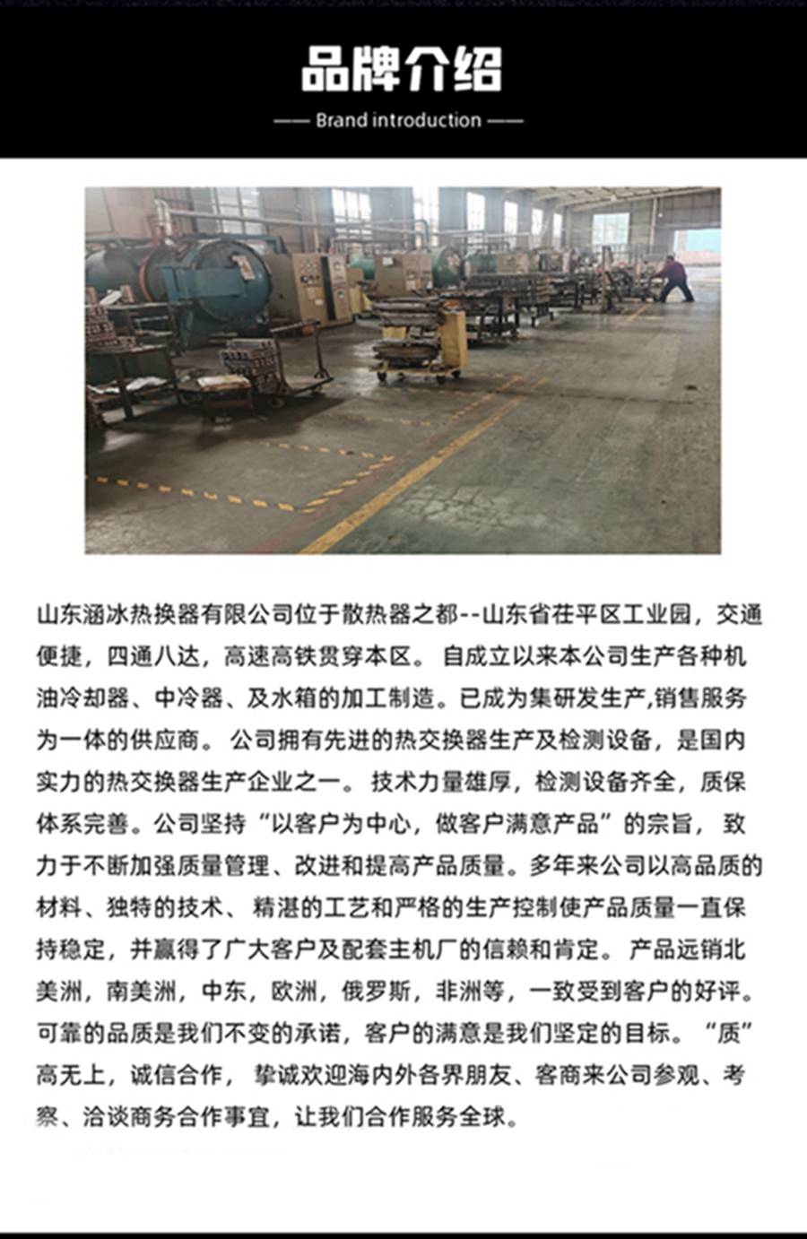 本公司位于散热器之都--山东省茌平区工业园,交通便捷,四通八达,高速高铁贯穿本区。 自成立以来本公司生产各种机油冷却器、中冷器、及水箱的加工制造。已成为集研发生产,销售服务为一体的供应商。 公司拥有***的热交换器生产及检测设备,是国内实力的热交换器生产企业之一。 技术力量雄厚,检测设备齐全,质保体系完善。公司坚持“以客户为中心,做客户满意产品”的宗旨, 致力于不断加强质量管理、改进和提高产品质量。多年来公司以高品质的材料、独特的技术、 精湛的工艺和严格的生产控制使产品质量一直保持稳定,并赢得了广大客户及配套主机厂的信赖和肯定。 产品远销北美洲,南美洲,中东,欧洲,俄罗斯,非洲等国家,一致受到客户的好评。 可靠的品质是我们不变的承诺,客户的满意是我们坚定的目标。“质”高无上,诚信合作, 挚诚欢迎海内外各界朋友、客商来公司参观、考察、洽谈商务合作事宜,让我们合作服务全球。