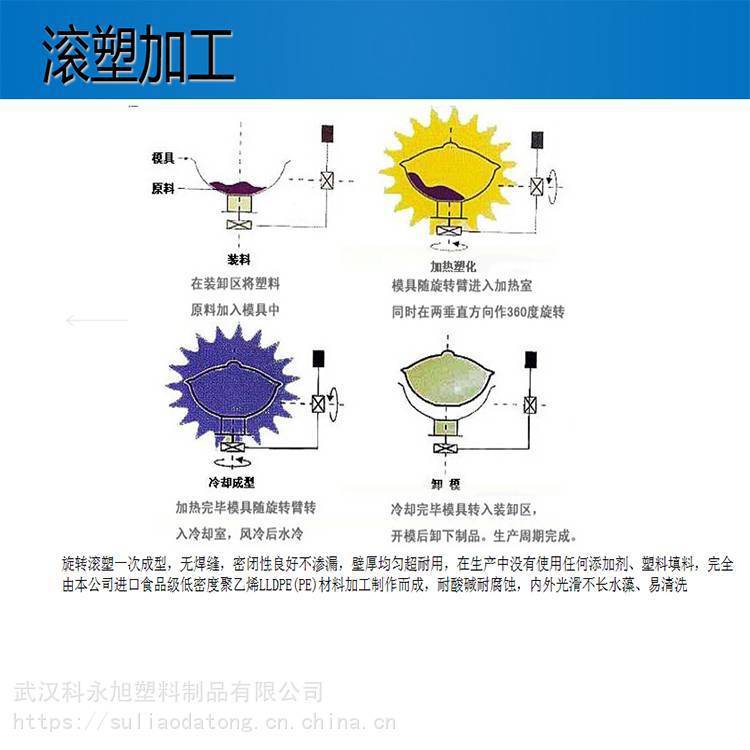 武汉塑料水箱厂家批发食品级PE塑料水箱 武汉科永旭立足武汉专业生产500L——50吨塑料水箱,是武汉比较专业的塑料水箱厂家;拥有占地5000平方米的具现代化气魄的标准厂房。主要生产及销售塑料水塔,塑料水箱,10吨塑料大桶 20吨塑料储罐 30吨化工塑料储罐 锥底加药搅拌罐pe水箱,加药箱,塑料储罐,聚乙烯储罐,搅拌桶,化工液体储罐,环保储水箱,药剂桶,食品桶,塑料搅拌罐,滚塑OEM,ODM等,一直以来受到长期合作单位和客户的满意 武汉科永旭是武汉比较专业的塑料水箱厂家;拥有现代化生产车间和一支富有创意研发、精专敬业的专业团队,生产上有十余名专注于滚塑技术十二年以上经验丰富的工程师、工艺师和***技工。所有产品采用***高标准,安全生产, 产品出厂可提供合格证、检测报告等文件。只要购买了我公司产品并严格参照我公司使用手册规范操作,享有终身品质免费服务,1年免费售后服务 武汉科永旭塑业拥有一批经验丰富,多年从事塑料制品加工研究,设计,制造和试验的工程技术人员和管理人员。曾与国内外同行,专业研究部门,武汉知名大专院校进行广泛的合作, 可向客户提供从产品设计到模具开发、塑件加工、表面处理等系列化服务, 在滚塑制品加工工艺方面积累了丰富的经验,公司现拥有滚塑一次成型系列设备上百台。采用数控全自动滚塑塑机,滚塑穿梭机、大型明火摇摆机、多套小型明火加热直燃式摇摆滚塑机、直燃式摇摆 等专业硬件设备并严格参照中国GB9687-88卫生质量标准和企业标准,设计制造***,经久耐用、美观大方,造型新颖的滚塑产品:,产品优势明显,耐化学腐蚀,使用寿命长;具有特殊的耐腐性能,可以耐多种酸、碱、盐和有机溶剂,设计灵活性大,结构性能优异,耐压***,重量轻强度高,隔热绝缘,防渗,表面光滑等特点,产品广泛使用于机械仪表、五金电子、物流仓储、化工、医药、环卫、生物、染料、冶金、稀土、电镀涂装、电力、纺织印染、环保水处理、水产养殖、酿造、食品等行业。 武汉科永旭塑料制品有限公司立足武汉,面向全国。公司以市场需求为导向,科技开发为动力,凭着优良的技术及诚信的理念,将科技成果不断转化为生产力,生产开发出实用新颖的各类产品。pe塑料水箱等滚塑容器销往武汉、荆州、襄樊、十堰、宜昌、黄冈、孝感、鄂州、咸宁等湖北省全境,并远销至北京、天津、广州、上海、重庆、深圳、山东、江西、湖南、河南、安徽、陕西、黑龙江、甘肃、四川、贵州、云南
