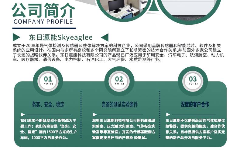 深圳市东日瀛能科技有限公司创立于2012年,东日瀛能始终将科技进步作为企业的生命,不断追求技术进步、周到的服务。不断完善在线监测,服务方案视与客户有效沟通与信任的基础。东日瀛能始终以改善中国大气环境为己任;以人民呼吸健康空气为目标;以解决客户实际需求为出发点;全力打造***品牌。 东日瀛能主要是以“工业”为主题的深圳仪器仪表研发,目前经多年努力涉及多个行业领域,在石油、石化、化工、冶金、燃气、矿山、制药、熏蒸、电力、电信、市政等领域用户,并树立起良好的企业形象.。主导产品:可燃气体报警器,有毒有害气体检测仪;VOC环境监测;无人机大气监测;工业大气监测;CEMS烟气等在线监测系统;东日瀛能开始研发"Skyeaglee"系列品牌产品,取得多具证书,CPA、ROHS、CE、SIL等10多项认证。 东日瀛能品牌检测仪国产化替代进口检测仪表,成为深圳自创企业品牌。深圳市东日瀛能科技有限公司生产、经营气体检测仪,报警器,变送器,传感器模组及气体检测装置。针对有毒可燃有机物VOC,氨气,一氧化碳,二氧化碳,臭氧,过氧化氢,溴甲烷,硫酰氟,硫化氢,六氟化硫,磷化氢,氯化氢,氢氟酸,氟化氢,氢气,硅烷,氯气,苯气体,二甲苯,柴油,汽油,甲醛,二硫化碳,甲烷,可燃气体等多种气体的浓度,泄露,烟气排放CEMS监测系统实时在线浓度检测和分析
