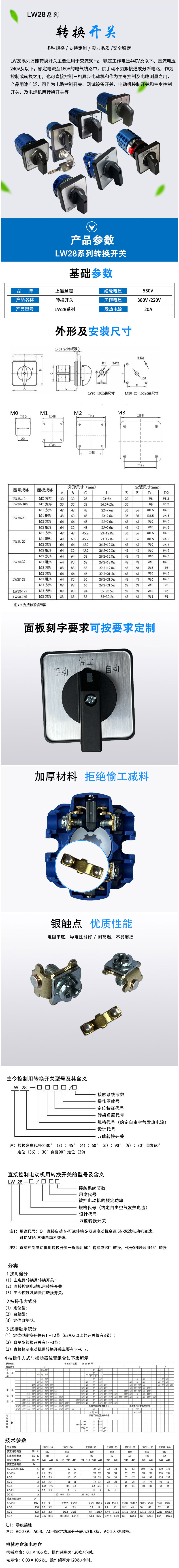 LW28系列转换开关主要适用于交流50Hz、额定工作电压440V及以下、直流电压240V及以下,额定电流至160A的电气线路中,供手动不频繁接通或分断电路,作为控制或转换之用,也可直接控制三相异步电动机和作为主令控制及电路测量之用。
