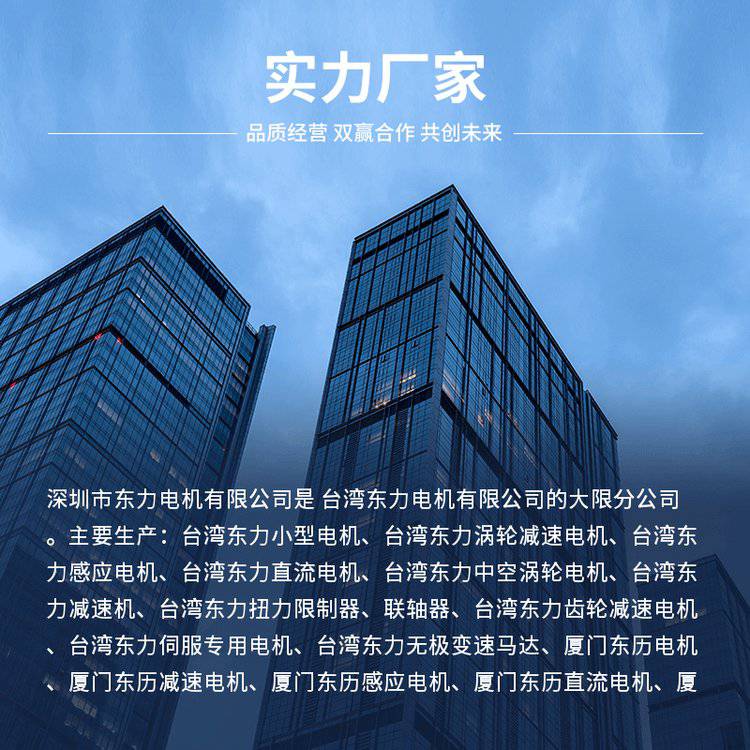 深圳市东力电机有限公司是 台湾东力电机有限公司的大限分公司。主要生产:台湾东力小型电机、台湾东力涡轮减速电机、台湾东力感应电机、台湾东力直流电机、台湾东力中空涡轮电机、台湾东力减速机、台湾东力扭力限制器、联轴器、台湾东力齿轮减速电机、台湾东力伺服专用电机、台湾东力无极变速马达、厦门东历电机、厦门东历减速电机、厦门东历感应电机、厦门东历直流电机、厦门东历小型电机、厦门东历减速机等产品。公司的产品不仅品质优越、结实耐用而且有着良好的售后保障。公司的产品广泛用于立体停车设备,快递自动分拣设备,食品机械,工具机械设备,运动器材设备,水利机械,电子机械设备,航空设备,仓储输送机械设备,油压机械设备,数控车床,化工仪器,广告设备,木工机械,电镀设备,纺织机械,PCB设备,电子仪器,电线电缆机械,金融业设备,包装机械,自动仓储系统, 印刷机械、专业自动化、***兵器等等!公司在原有的基础上不断引进新技术,开发新产品,真诚服务于国内广大客户!公司的产品不仅在国内有良好的销量,而且还远销美国、新加坡、德国,日本、马来西亚、澳洲、泰国等地。欢迎新老客户前来咨询!