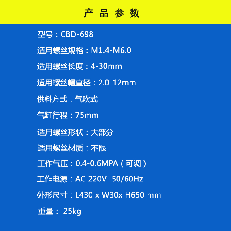 | 适用螺丝长度:4-30m | 适用螺丝帽直径::2.0-12mm | 供料方式:气吹式 |