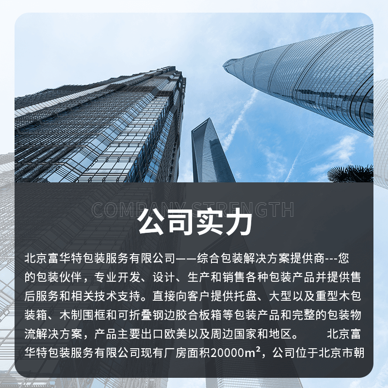 北京富华特包装服务有限公司——综合包装解决方案提供商---您的包装伙伴,专业开发、设计、生产和销售各种包装产品并提供售后服务和相关技术支持。直接向客户提供托盘、大型以及重型木包装箱、木制围框和可折叠钢边胶合板箱等包装产品和完整的包装物流解决方案,产品主要出口欧美以及周边国家和地区。 北京富华特包装服务有限公司现有厂房面积20000m?,公司位于北京市朝阳区,在天津、廊坊、秦皇岛等地设有办事处和物流周转仓库,在东北林区设有自己的原材料加工基地。目前,富华特包装已发展成为以木制品包装为主、整体包装服务相配套的综合实体。 北京富华特包装服务有限公司是北京市出入境检验检疫局北京地区具备出口木包装制品***热处理(IPPC)资质的单位。北京富华特包装服务有限公司生产的木包装已通过中国质量认证中心(CQC)的认证,符合欧盟RoHS指令标准及相关***,满足出口产品的各种要求。 除了向用户提供设计与产品以外,富华特还提供一系列的增值服务项目。这些服务包括为用户进行完整的包装物流库存管理,从采购,现场包装,仓库管理(包括及时送货,物流控制,材料选购开发,装卸,形象宣传等更多)。富华特将自己定位于包装材料供应商与用户之间,起着包装材料的整合供应的作用。 北京富华特包装服务有限公司还有一项非常好的业务模式(托盘租赁)为用户不断降低供应链成本,帮助客户节省时间、资金和人员投入。 通过富华特强大的技术力量、客观而全程的业务视角、庞大的供应系统和采购能力,再加上长期积累的包装知识与经验,令富华特能够为客户提供“量身定做”的方案来回应每一位客户不同的需求。 欢迎您来到北京富华特包装服务有限公司!富华特将成为您安全、专业的包装伙伴!