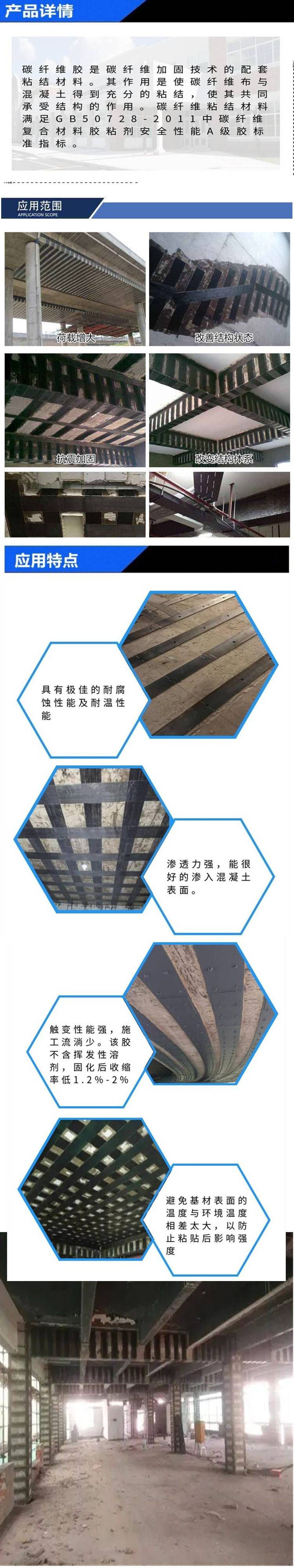 本产品是双组份改性环氧树脂胶粘剂,主要用于加固构件表面碳纤维、芳纶纤维及其他纤维片材的浸渍和粘贴。