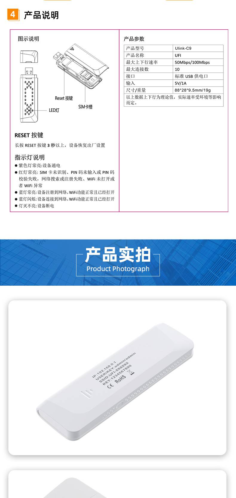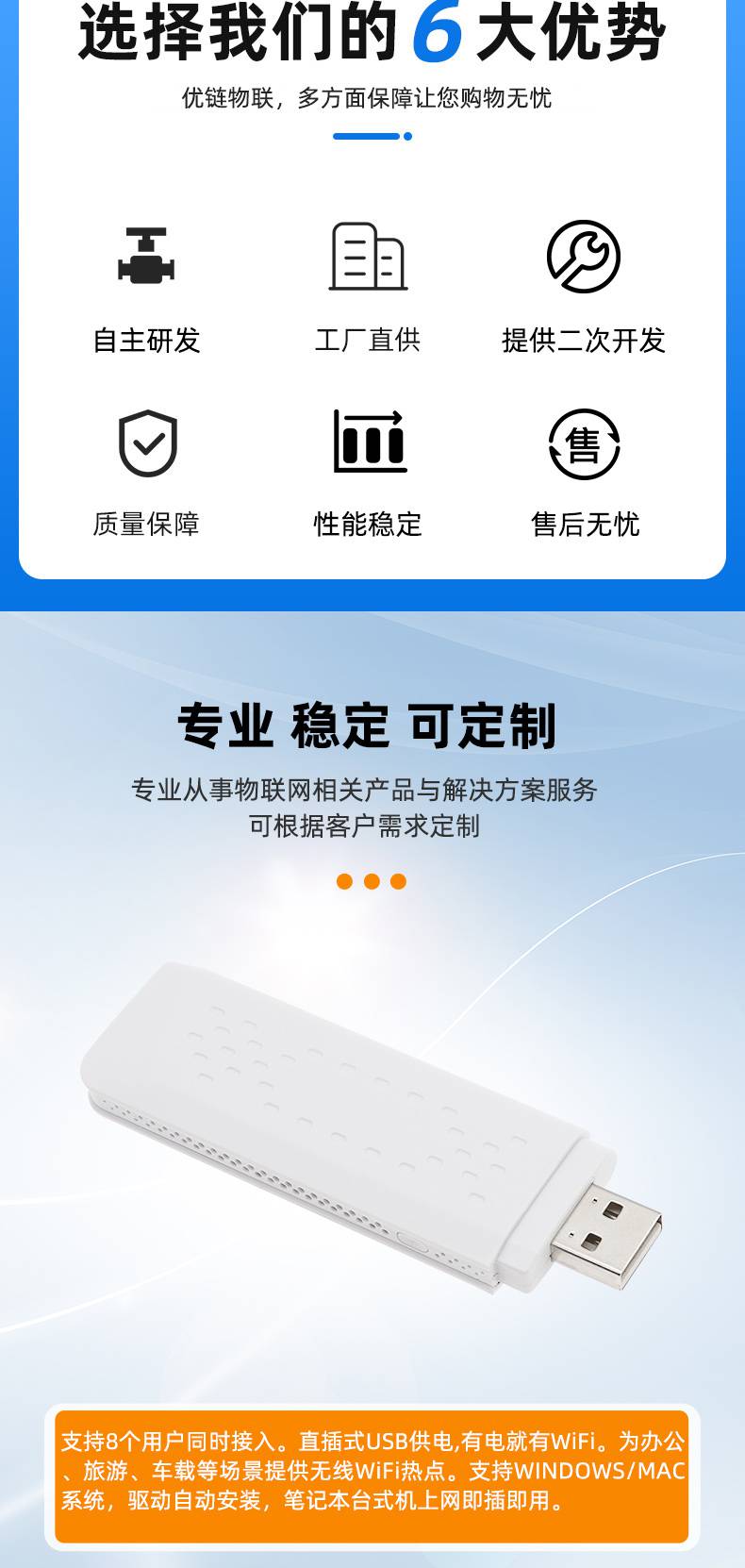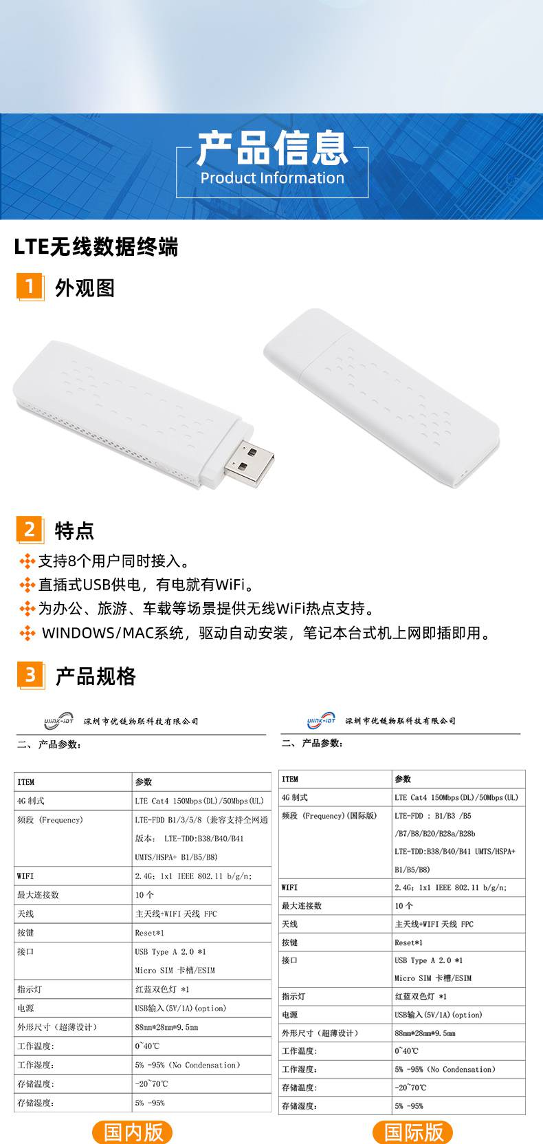 本页信息为深圳市优链物联科技有限公司为您提供的"LTE无线数据CAT4便携式wifi终端UFI直插式USB供电4G转WIFI卡托"产品信息,如您想了解更多关于"LTE无线数据CAT4便携式wifi终端UFI直插式USB供电4G转WIFI卡托"价格、型号、厂家请联系厂家,或给厂家留言。 进入店铺