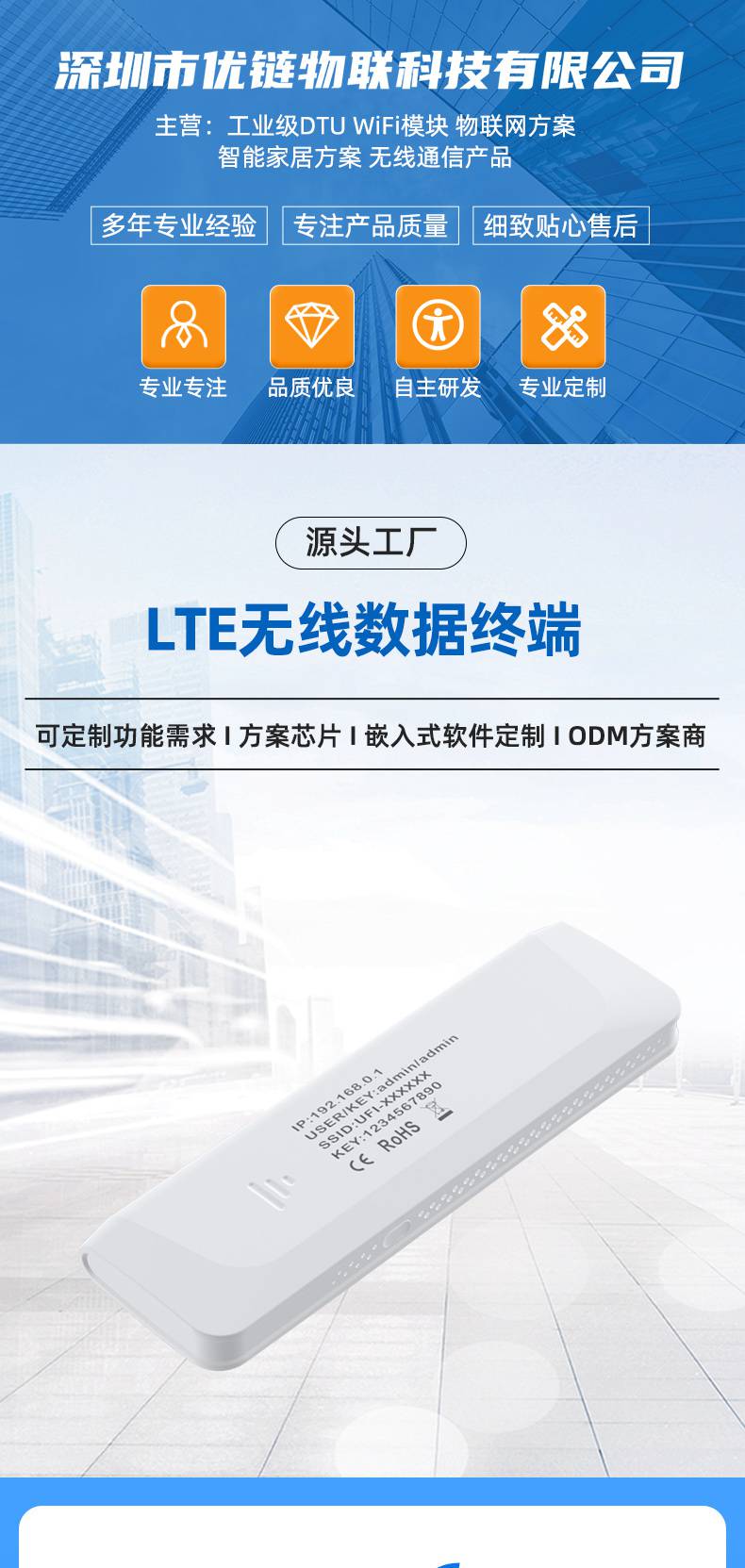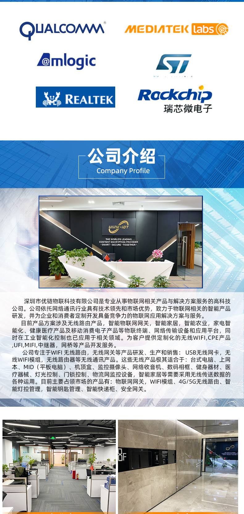 深圳市优链物联科技有限公司是专业从事物联网相关产品与解决方案服务的高科技公司。公司依托网络通讯行业具有技术***和市场优势,致力于物联网相关的智能产品研发,并为企业和消费者定制开发具备竞争力的物联网应用解决方案与服务。 目前产品方案涉及无线路由产品,智能物联网网关,智能家居,智能农业,家电智能化、健康医疗产品及移动消费电子产品等物联终端、网络传输设备和应用平台,同时在工业智能化控制也已应用于相关领域。为客户提供定制化的无线WIFI CPE产品,UFI,Mifi,中继器,网桥等产品开发服务。 公司专注于WiFi 无线路由,无线网关等产品研发、生产和销售: USB无线网卡,无线WiFi模组,无线路由器等无线通讯产品。这些无线产品***适合于:台式电脑、上网本、MID(平板电脑)、机顶盒、监控摄像头、网络收音机、数码相框、健身器材、医疗器械、灯光控制、门锁控制、物流网监控设备,智能家居等需要采用无线传送数据的各种运用。目前主要***的产品有:物联网网关,Wifi模组、4G/5G无线路由、智能灯控管理,智能钥匙管理、智能快递柜、安***关。