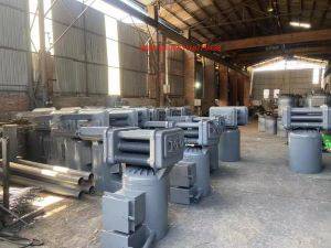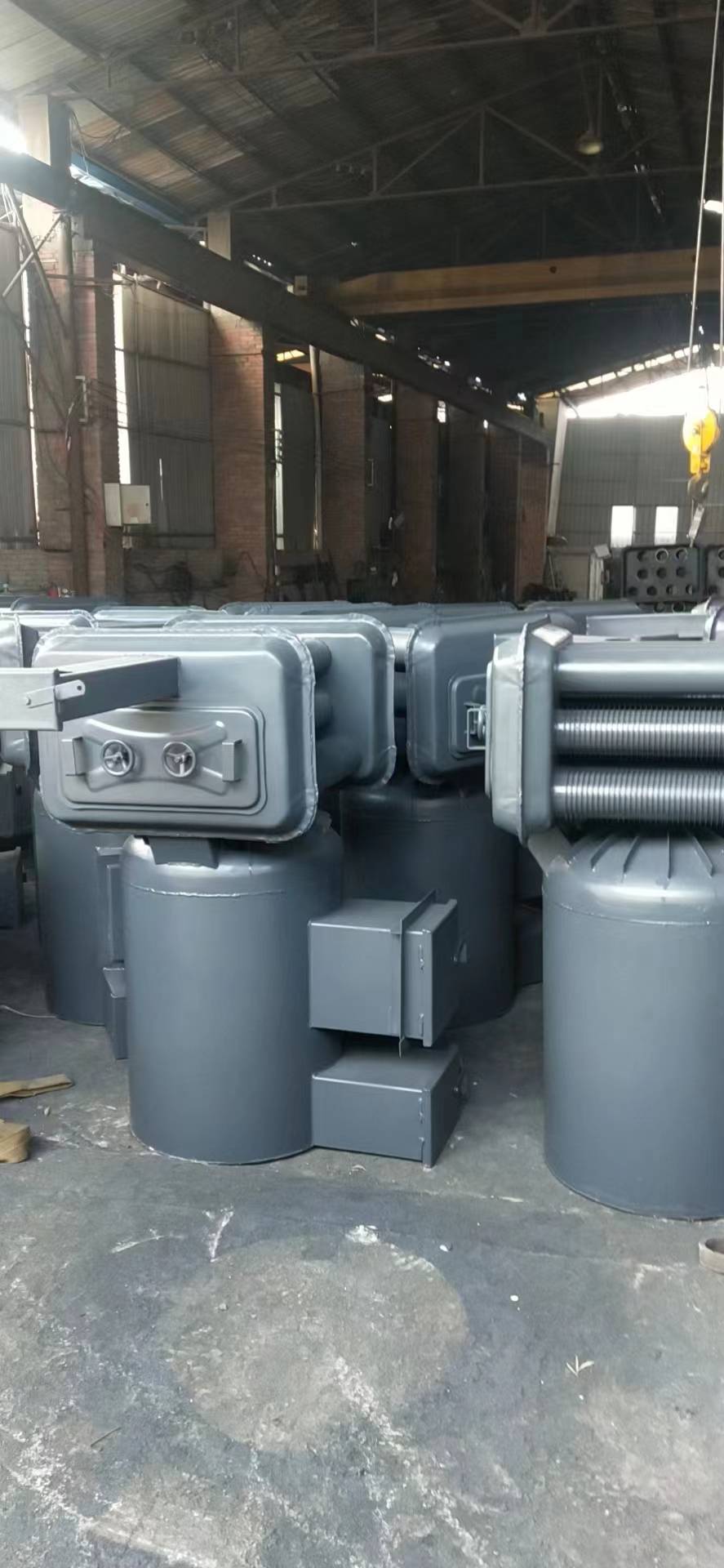 这种密集型高效能烤房主要由装烟室、加热室和热风循环控制系统三个部分组成:装烟室采用双门结构,容积约为70~90立方米。室内两侧墙壁上有三趟搭放烟杆的沟槽,中间设搭烟架。这些小窗口是观察窗,这里设两个排湿通道,中间的是热风循环通道。两侧墙壁上还有两个备用的排湿口。这里是加热室,下面是加热炉,炉上边六根铁管是换热器,它除承担散热作用外还是加热炉的烟囱。这是加热室和装烟室的过渡间。热风循环控制系统由循环风机、鼓风机、数字化控制器、干球温度计和湿球温度计组成。干球温度计检测的是烤房内的温度、湿球温度计检测的是烤房内的湿度,干球温度减去湿球温度的差值,我们这里称为“干湿差”。