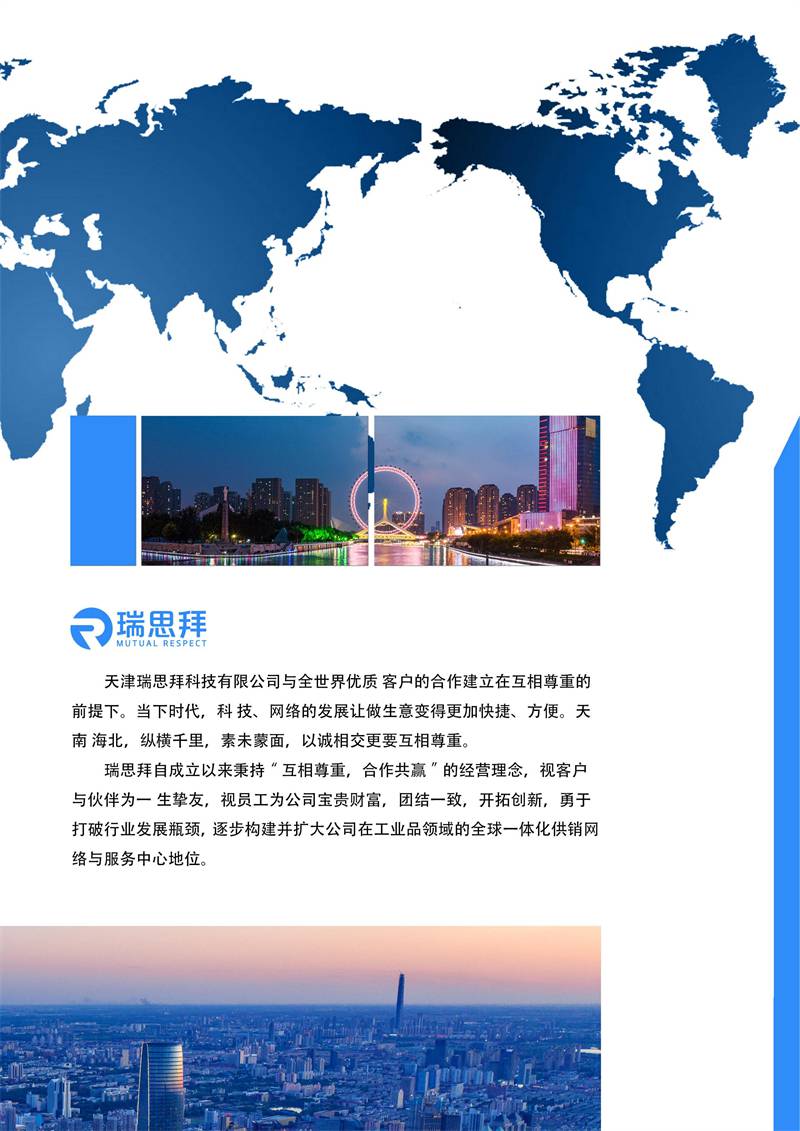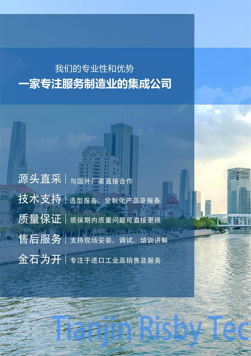 天津瑞思拜科技有限公司(Tianjin Risby Technology Co.,Ltd)是一家从事工业设备、自动化产品,仪器仪表等进口工业品服务商,提供过程控制技术咨询,工业自动化集成设计与改造,成套设备与技术引进等工业技术应用及产品供应服务。产品广泛应用于能源化工、汽车制造、冶金、石油、航空航天、电力、电子、食品饮料、制药、注塑、橡胶、医疗等行业。瑞思拜与欧美众多厂家达成战略合作,为中国制造业赋能,提供一个以工业品为依托,集售前选型,产品销售,技术服务,安装调试,售后服务于一体的平台。 瑞思拜即Respect,天津瑞思拜科技有限公司与***客户的合作建立在互相尊重的前提下。当下时代,科技、网络的发展让做生意变得更加快捷、方便。天南海北,纵横千里,素未蒙面,以诚相交更要互相尊重。 瑞思拜自成立以来秉持“汇聚全球工业精品,服务中国制造业”的经营理念,视客户与伙伴为一生挚友,用心服务好每一位优质客户;视员工为公司宝贵财富,为全体员工的幸福努力奋斗,团结一致,***创新,勇于打破行业发展瓶颈,逐步构建并扩大公司在工业品领域的全球一体化供销网络与服务中心地位。
