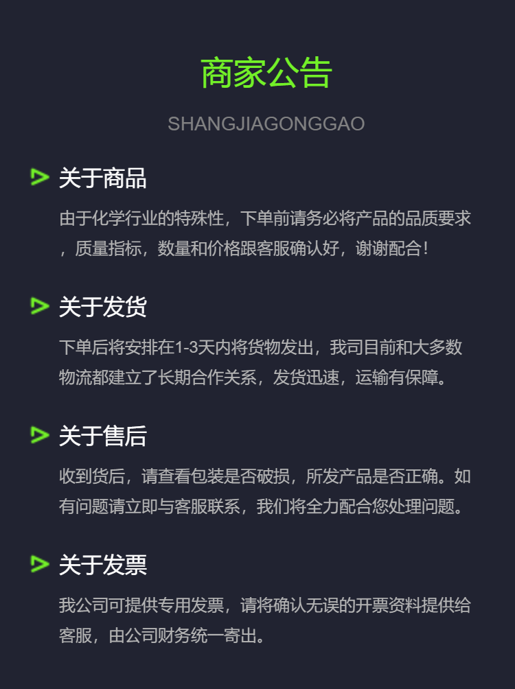 温州守诚化工科技有限公司坐落于经济发达,人文荟萃的历史文化名城--温州。 温州守诚化工科技有限公司成立于2019年,是一家专注于化工产品和化工新材料、研究、开发、生产及销售于一体的创新型高科技化工企业,总部及研发基地设立于浙江温州。公司技术和研发实力雄厚,拥有按GMP标准建造,设备***,配套齐全的3000余平方米生产车间;拥有完善的质量***体系和健全质量控制制度;拥有多套高效高灵敏度的***分析检测仪器,聚集了一批具有多年专业技术和管理经验的员工队伍,对产品进行***分析和监控。我们将不断地完善质量管理体系,并发挥大的效能,为产品品质稳定和产品性价比的不断提升提供有力***。 温州守诚化工科技有限公司公司自成立以来,始终坚持秉承“以质量求生存,以信誉求发展,客户至上、服务至上,长期合作,互惠共赢”的经营原则,荟萃***骨干精英,以优质的服务、专业的技术、快速的回应、真诚的态度服务客户。公司紧邻长江三角洲产业带,经济资源丰富,产业基础雄厚,交通便利,海陆空运输十分发达。公司依靠不断的努力和创新取得了飞速发展。守诚化工实力雄厚,重信用、守合同、价格合理、***产品质量、售后服务优质,以多品种经营特色和薄利多销的原则,赢得了广大客户的信任。守诚化工公司生产的产品:异硬脂酸、对羟基苯磺酸、2-羧乙基苯基次膦酸CEPPA、四甲基硫脲、鱼溶浆,乌贼膏等***各地,深受客户好评。 今后将进一步向精细化工迈进,专注于可持续发展、更加安全、环保的产品和服务满足用户需要,进而把企业做强做大,实现企业又好又快和谐发展。******,勇攀高峰,我们坚信守诚化工的明天会更加美好。