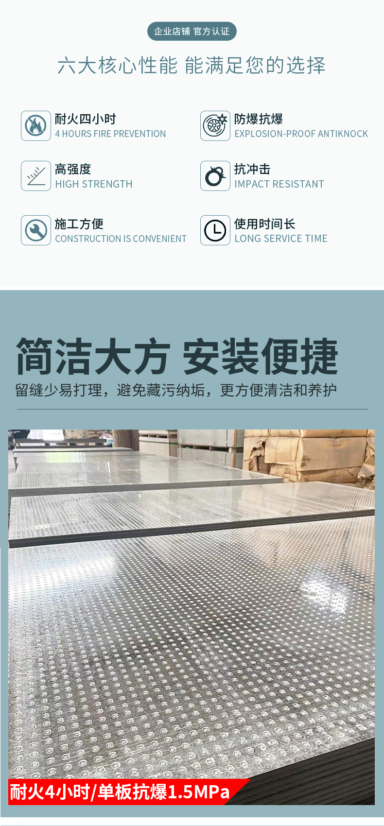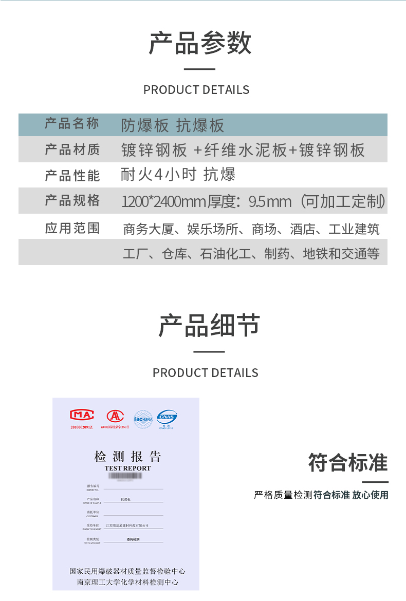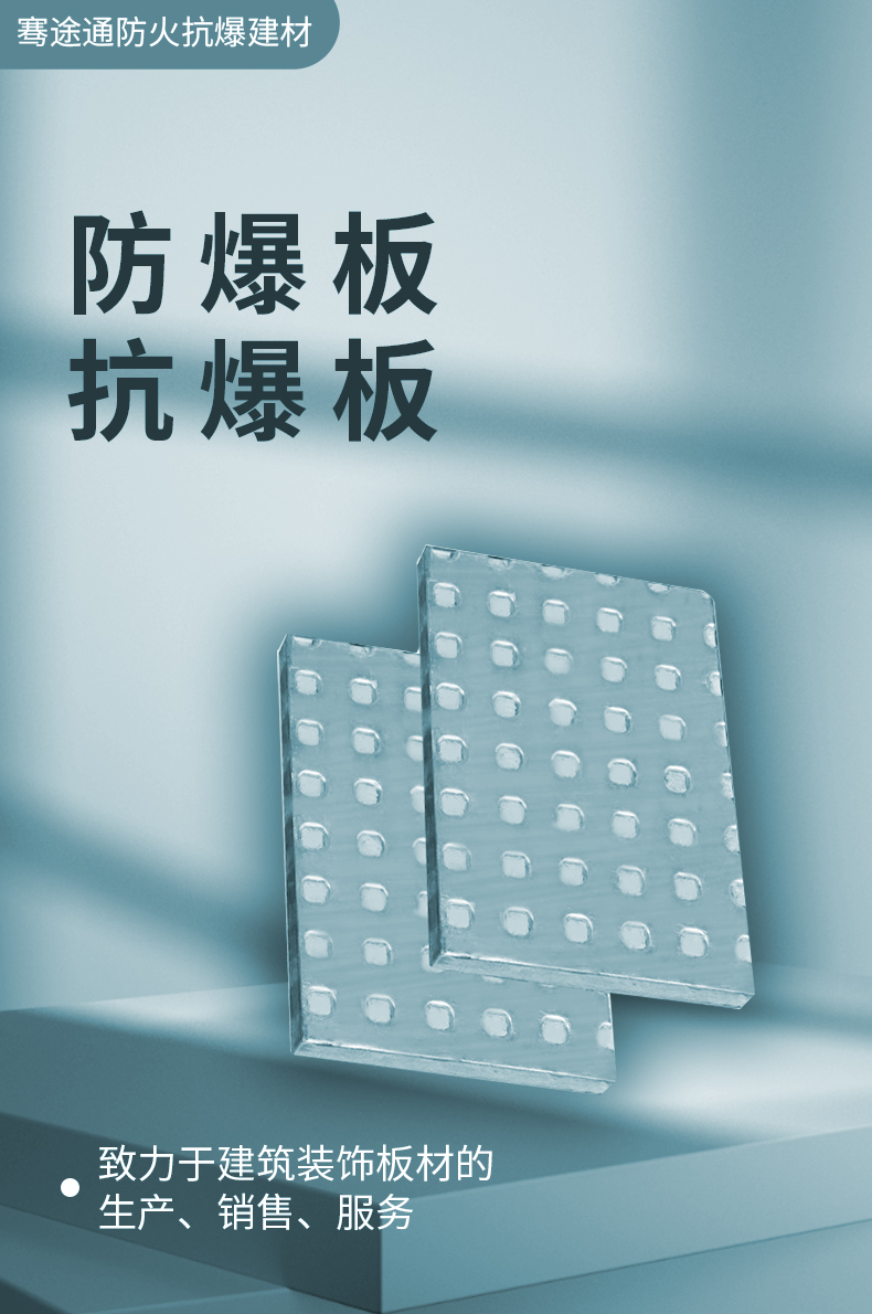 防爆板轻盈、强度、冲击、稻瘟病抗性、耐久性与特殊防火,使得消防人员可以尽量的免除一场火灾,保障社会的生命和财产安全。全世界在各种行业,包括电站、核电、石油化工、制药、钻井平台、仓库、机场、铁路和地铁设施。