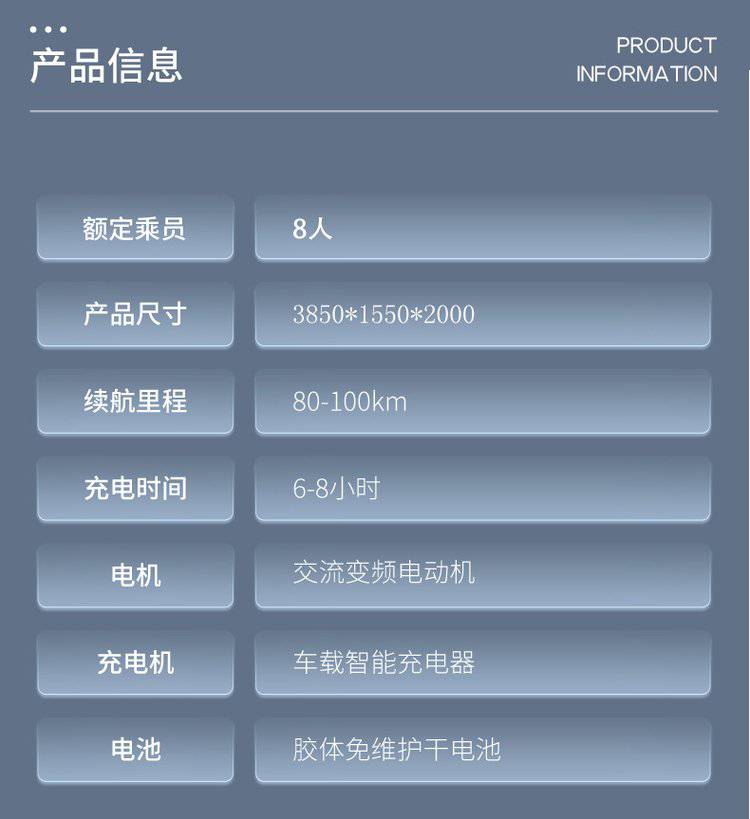 | 最高车速:30(km/h)km/h | 整车外形尺寸:3850*1550*2000(mm)mm | 是否现货:是 |