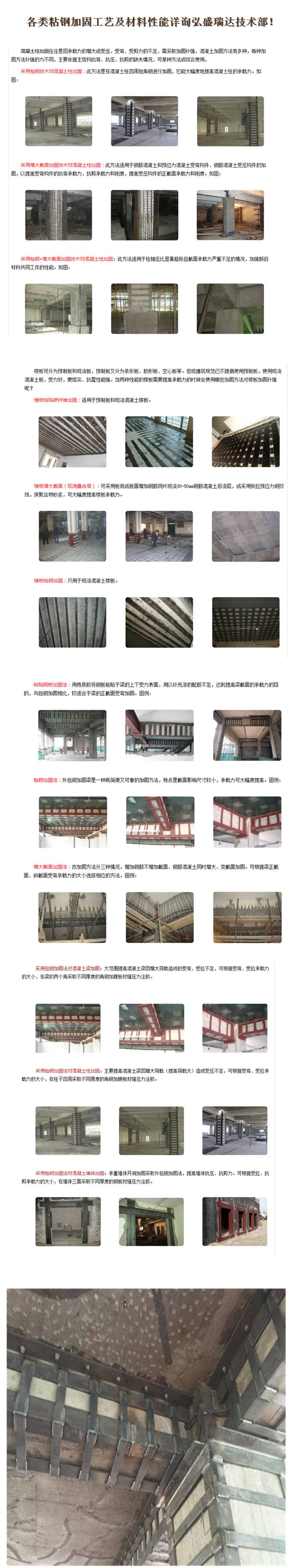 混凝土基面放线、打磨——混凝土基面清理——钢板下料——钢板钻孔、打磨——植M12化学栓,钢板预贴——粘钢胶配制——涂胶和粘贴——固化、卸加压固定系统——检验、维护。