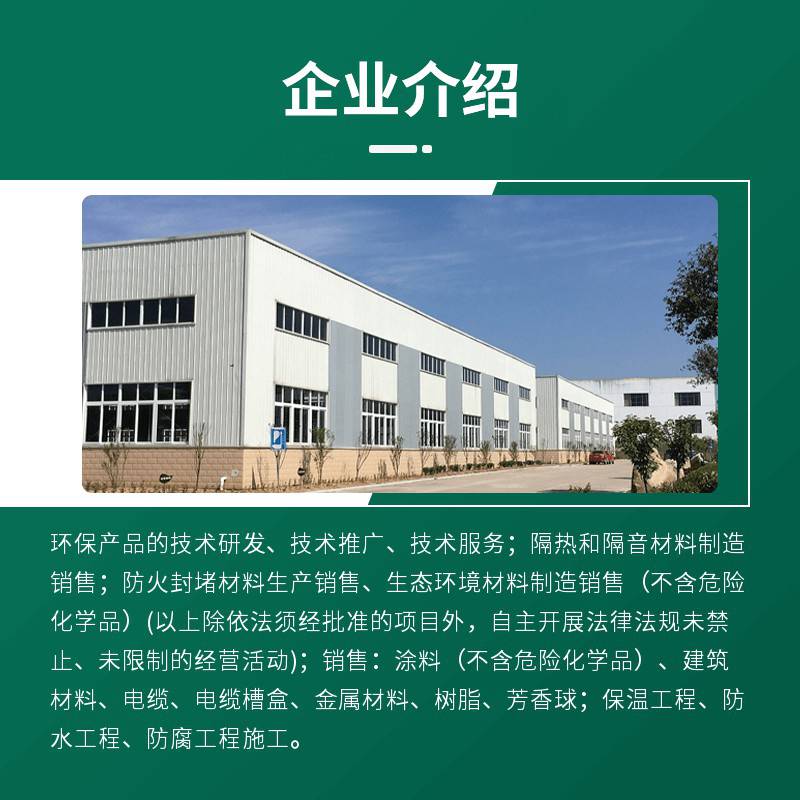 | 经营范围 | 环保产品的技术研发、技术推广、技术服务;隔热和隔音材料制造销售;防火封堵材料生产销售、生态环境材料制造销售(不含危险化学品)(以上除依法须经批准的项目外,自主开展法律法规未禁止、未限制的经营活动);销售:涂料(不含危险化学品)、建筑材料、电缆、电缆槽盒、金属材料、树脂、芳香球;保温工程、防水工程、防腐工程施工。(依法须经批准的项目,经相关部门批准后方可开展经营活动) | ||