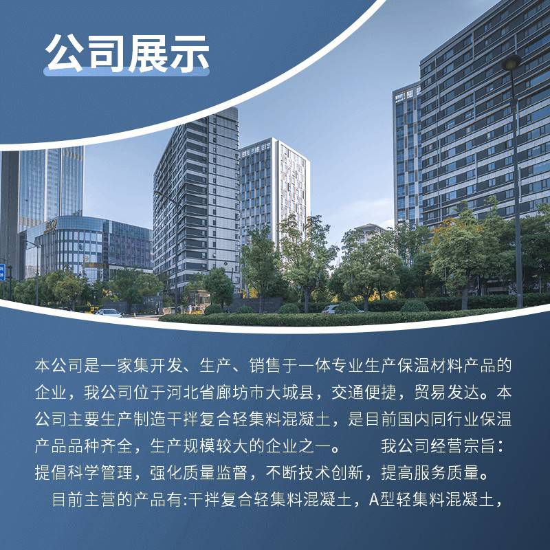 本公司是一家集开发、生产、销售于一体专业生产保温材料产品的企业,我公司位于河北省廊坊市大城县,交通便捷,贸易发达。本公司主要生产制造干拌复合轻集料混凝土,是目前国内同行业保温产品品种齐全,生产规模较大的企业之一。 我公司经营宗旨:提倡科学管理,强化质量监督,不断技术创新,提高服务质量。 目前主营的产品有:干拌复合轻集料混凝土,A型轻集料混凝土,B型轻集料混凝土,LC5.0轻集料,LC7.5轻集料混凝土。本公司产品不仅规格齐全,而且可为用户“量身订做”各种产品,做到科学设计、奉献精品来满足不同用户的需求。公司始终坚持“关注客户、质量优先、持续改进、共同发展”的质量方针,以全过程质量目标管理为主体,以满足客户需求为核心,成立了以总经理为首的质量控制管理中心。竭诚欢迎国内外新老客户的光临指导。愿我们携手合作,共创未来。