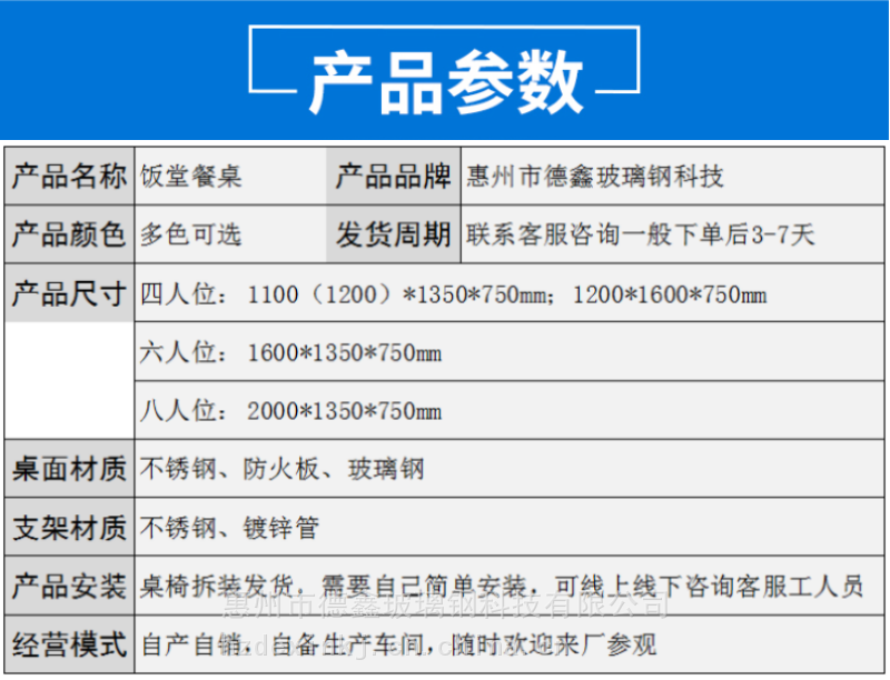 公司简介 惠州市德鑫玻璃钢科技有限公司,经过7年多的努力与发展,已具一定的规模及实力,于2020年搬到惠州。现拥有一批专业的生产技术人员,生产车间、烤漆房,为各行各业、不同群体提供更优质的产品。 我们主要生产:玻璃钢餐桌、不锈钢餐桌、防火板餐桌、铁床、篮球架、球场、户外健身器材、休闲椅等,承接停车棚、围网、塑胶跑道、防腐防尘,环氧地坪等工程。 公司自成立以来,始终坚持以人为本,诚信立业的经营原则,不断谋求新的发展,尽心尽力为客户.多年来,始终以优良的品质、良好的信誉、优质的服务及合理的价格深受广大客户的好评,也赢得了广大客户的支持,并保持着愉快的长期合作的良好关系。使我司在激烈的市场竞争中始终保持竞争力,快速、稳定地发展。 安全***,质量为本,公司加大安全、质量管理力度,提高全员质量意识,改进质量,***质量,让客户购物无忧。 未来,惠州德鑫将不断开发新款式、新产品,更能适合和满足各档次的需求和市场的发展。