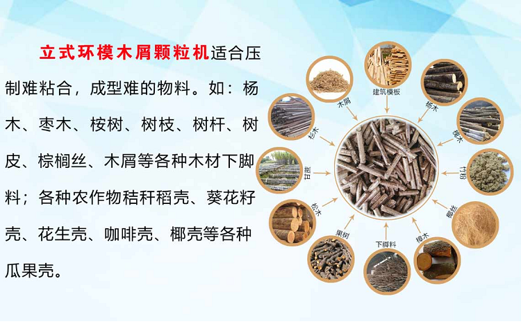 采用环形模具和压轮之间挤压力和模孔摩擦力相互作用原理,使物料获得成型。物料的加工过程中不需要加入任何添加剂和粘结剂,木质物料具有软化特点,当温度达到一定值时,软化,粘结力量增强在一定的压力作用下,使纤维分子团错位,变形,延展,内部相邻的生物质颗粒重新组合而压制成型。