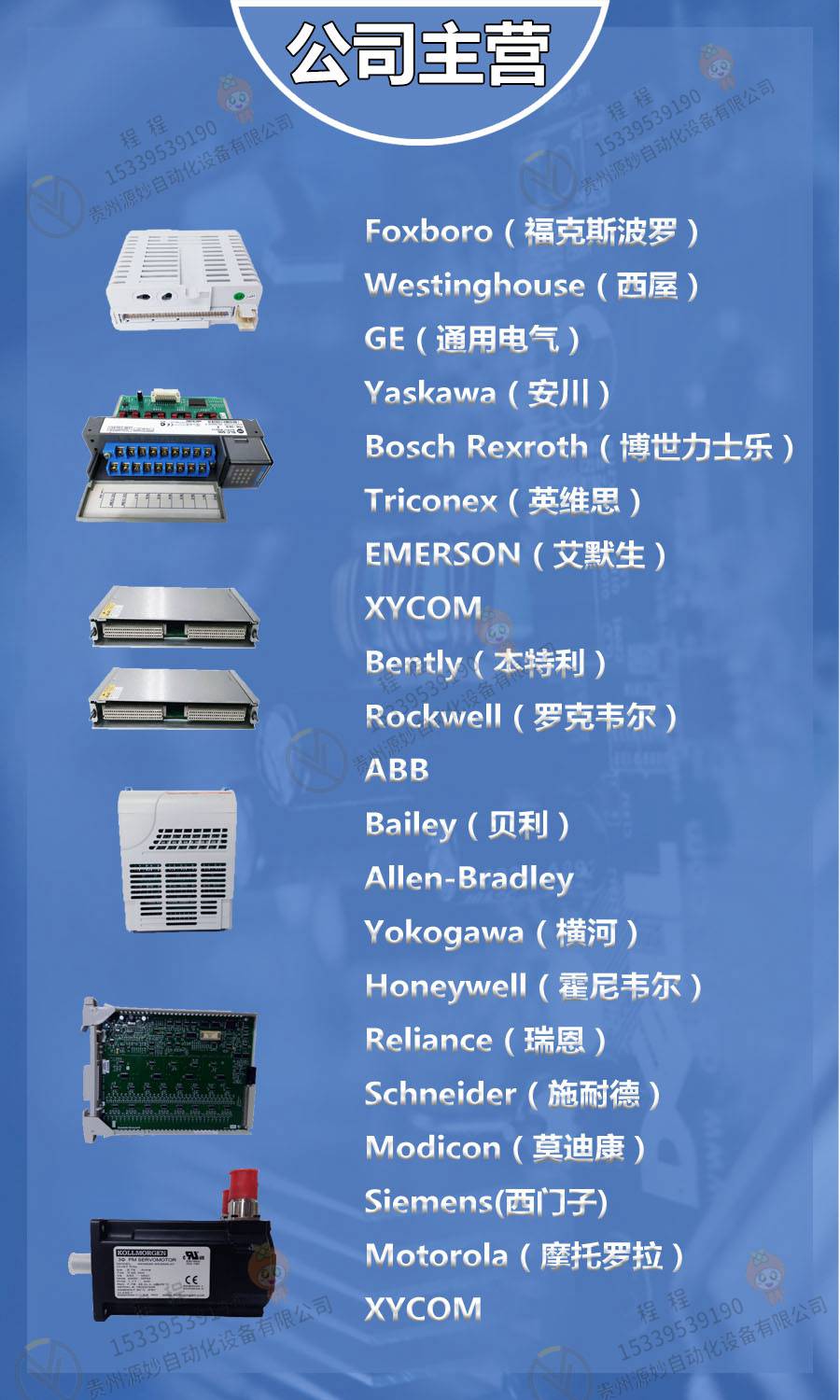 世界***的PLC 、DCS 系统备件 模块,优势供应,充足库存Foxboro(福克斯波罗):I/A Series系统,FBM全系列(现场输入/输出模块)顺序控制、梯形逻辑控制、事故追忆处理、数模转换、输入/输出信号处理、数据通信及处理等。Westinghouse(西屋):1C31系列DCS系统、CPU、OVATION系统、WDPF系统、WEStation系统备件。Triconex(英维思):冗余容错控制系统、基于三重模件冗余(TMR)结构的现代化的容错控制器。EMERSON(艾默生):模块、卡件、驱动器等各类备件。XYCOM:XVME系列Bently(本特利):3500/3300系统。Rockwell(罗克韦尔):ICS系统。ABB:PM全系列DCS系统、IGCT高压变频器系列、工业机器人备件DSQC系列、INFI 90等。Bailey(贝利):BRC系列DCS系统等。Allen-Bradley:1756、1785、1771、1746全系列系统等。Yokogawa(横河):CP系列等。Honeywell(霍尼韦尔):TK/TC/CC系统等。Reliance(瑞恩):57C系列等。Schneider(施耐德):140系列处理器、控制卡、电源模块等。Modicon(莫迪康):AS系列PLC系统备件。