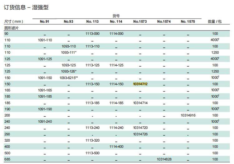 ***575:<2 m* 高湿强,慢流速。化学耐受性与 1573 滤纸的相似。