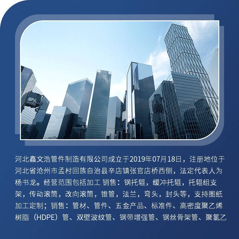 | 经营范围 | 加工 销售:法兰、弯头、三通;销售:管材、管件、五金产品、标准件、高密度聚乙烯树脂(HDPE)管、双壁波纹管、钢带增强管、钢丝骨架管、聚氯乙烯(PVC)管、聚乙烯(PE)管;货物或技术进出口(国家禁止或涉及行政审批的货物或技术进出口除外)。(依法须经批准的项目,经相关部门批准后方可开展经营活动) | ||