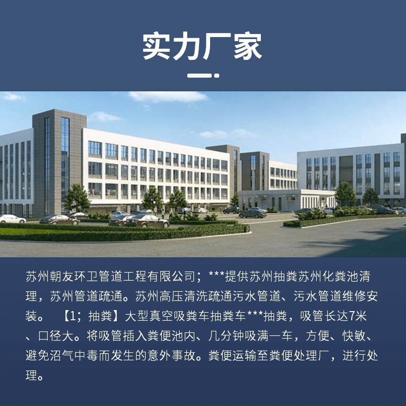 苏州朝友环卫管道工程有限公司;专业提供苏州抽粪苏州化粪池清理,苏州管道疏通。苏州高压清洗疏通污水管道、污水管道维修安装。 【1;抽粪】大型真空吸粪车抽粪车专业抽粪,吸管长达7米、口径大。将吸管插入粪便池内、几分钟吸满一车,方便、快敏、避免沼气中毒而发生的意外事故。粪便运输至粪便处理厂,进行处理。安全、清理疏通化粪池; 清理污水池,过滤池 隔油池。阴井清理。【2;疏通】大型高压清洗车,气和水混合的高压 高速射流,可控脉冲所形成的物理波动、对管内壁的锈垢,和沉积物进行冲击和震荡,使沉积物逐层剥落并快速排出管外,***清除管道里的油块泥沙及各种污垢 。管道不通不收费。