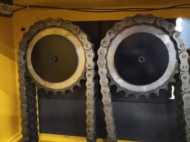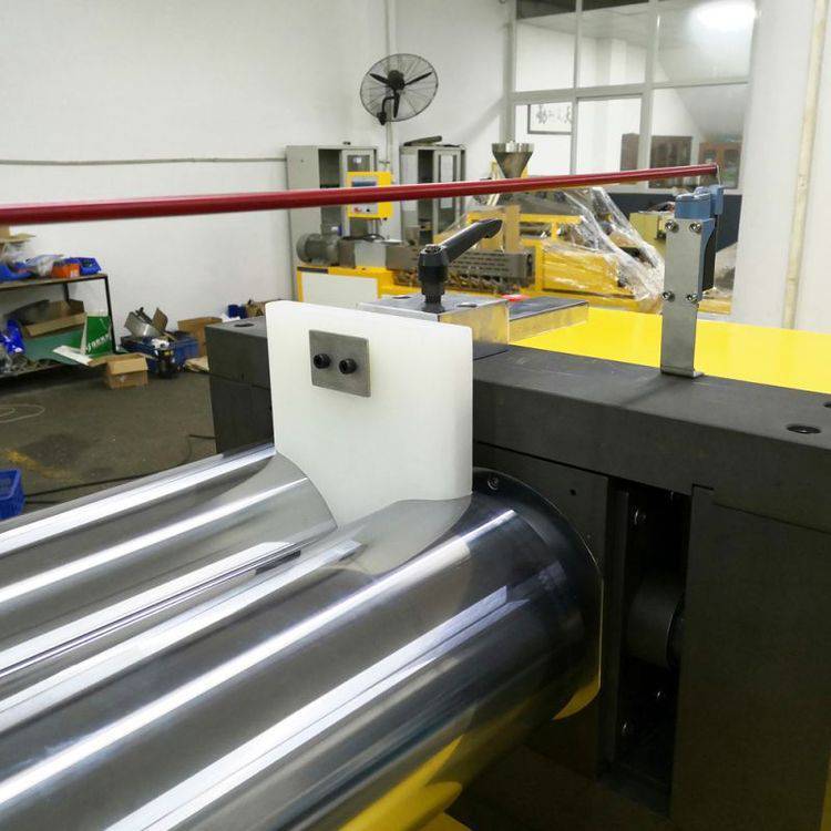 由相同大小的滚轮,按照一定的速率相对旋转,以及其内部发热丝所産生的温度,辗压原料。