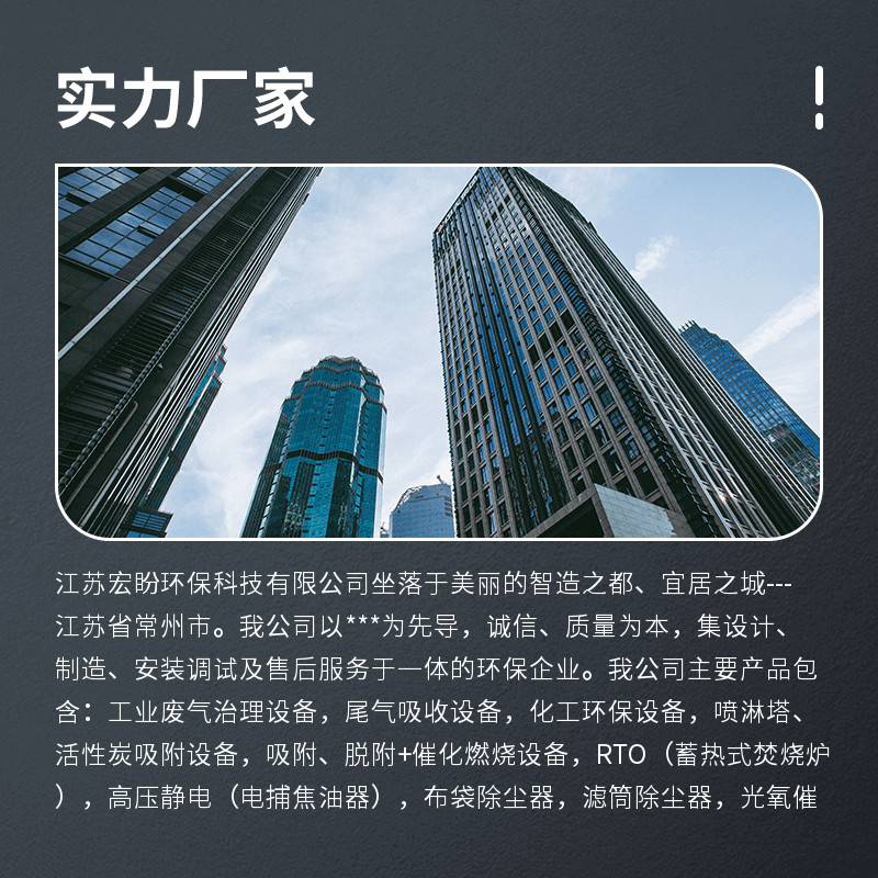 江苏宏盼环保科技有限公司坐落于美丽的智造之都、宜居之城---江苏省常州市。我公司以创新为先导,诚信、质量为本,集设计、制造、安装调试及售后服务于一体的环保企业。 我公司主要产品包含:工业废气治理设备,尾气吸收设备,化工环保设备,喷淋塔、活性炭吸附设备,吸附、脱附+催化燃烧设备,RTO(蓄热式焚烧炉),高压静电(电捕焦油器),布袋除尘器,滤筒除尘器,光氧催化,等离子净化器,电器控制系统,污水池废气收集处理设备,水处理设备等。 公司不断强化质量管理过程管控,针对设备的生产加工、安装调试制定了严格的质量巡查、检验制度,同时拥有专业的售后和技术服务团队,为客户提供全方位的售后和技术指导服务。优质的产品和贴心的技术服务赢得了客户的广泛好评, 绿水青山才是金山银山,在国家大力倡导生态文明建设的背景下,环保行业已然成为一个朝阳产业。宏盼环保的发展离不开社会各界朋友的信任和支持,让我们携起手来努力奋斗,共建共享安全、绿色、美好的幸福生活。