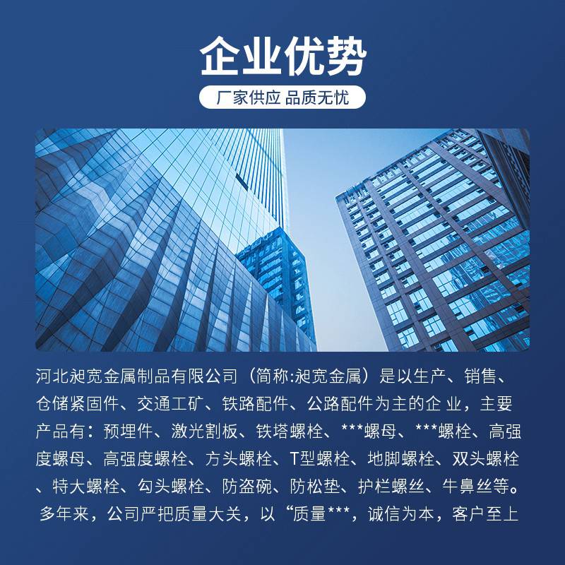 河北昶宽金属制品有限公司(简称:昶宽金属)是以生产、销售、仓储紧固件、交通工矿、铁路配件、公路配件为主的企 业,主要产品有:预埋件、激光割板、铁塔螺栓、国标螺母、国标螺栓、高强度螺母、高强度螺栓、方头螺栓、T型螺栓、地脚螺栓、双头螺栓、特大螺栓、勾头螺栓、防盗碗、防松垫、护栏螺丝、牛鼻丝等。 多年来,公司严把质量大关,以“***,诚信为本,客户至上”的思想宗旨, 在产品原材料上使用国内大 型钢厂的优质材料,根据国内的标准定制了严格的生产工艺流成和质量管理体系,赢得了广大客户的一致好评! 公司全面推行质量监控系统,统一计划,集中营销,质量和诚信是企业发展的根基,在激烈的市场竞争中,我们努 力去完善服务系统,和客户共赢齐分享胜利的果实是我们一直追寻的目标, 信泰公司始终坚持以诚为本,以优取胜,竭 诚为您服务,愿与您携手商海,共创未来!