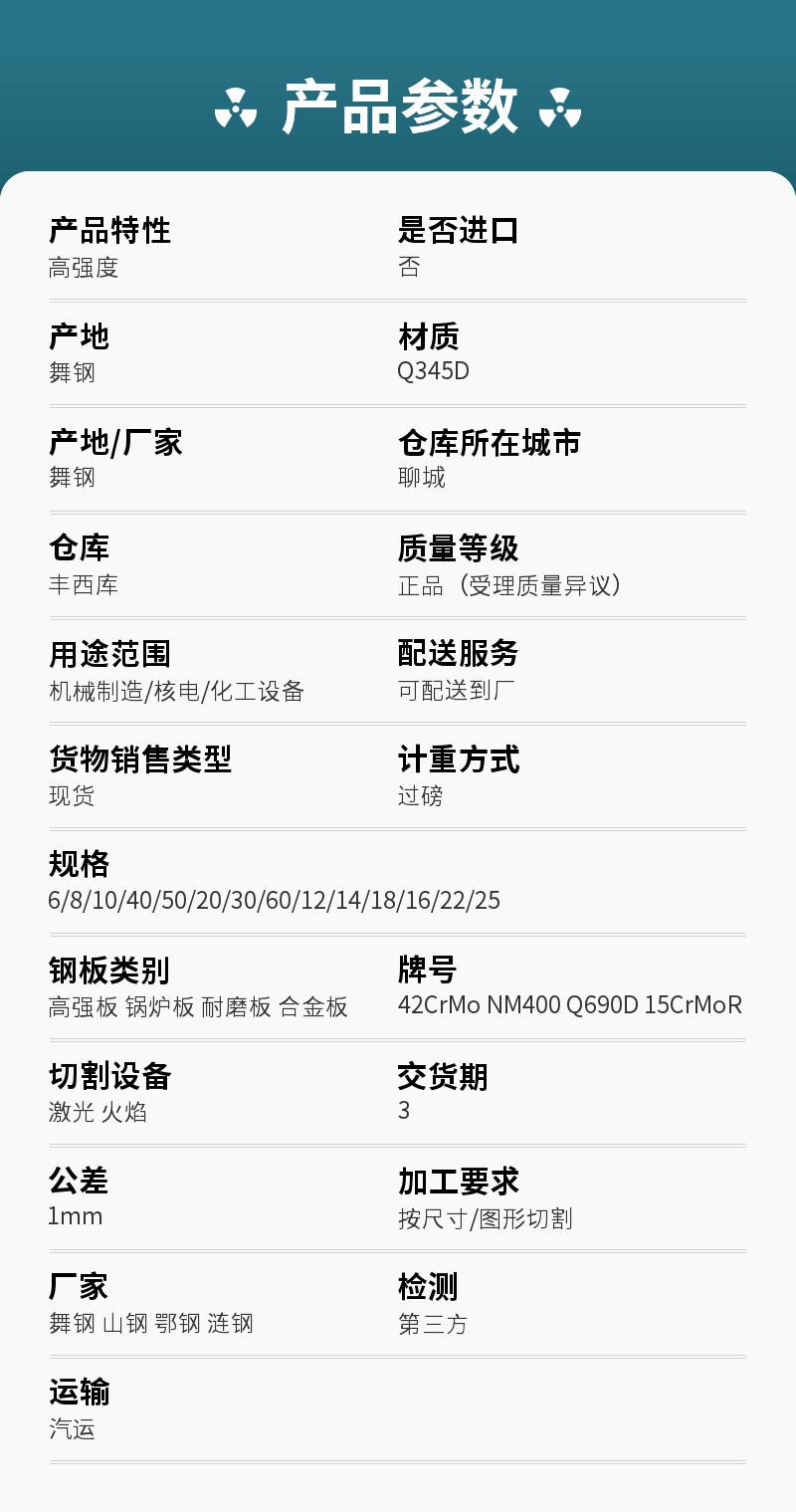| 材质:Q345D | 产地/厂家:舞钢 | 仓库所在城市:聊城 |