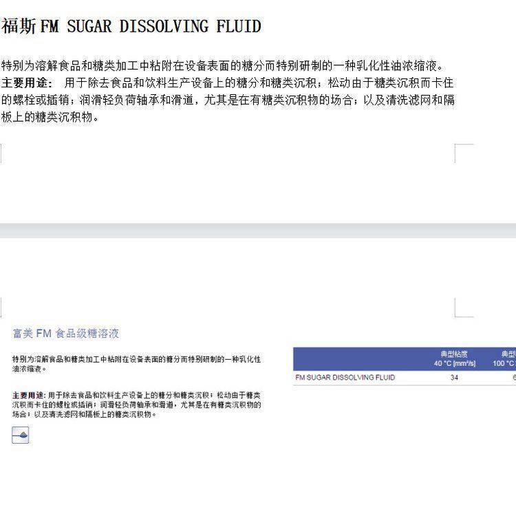 主要用途:用于除去食品和饮料生产设备上的糖分和糖类沉积;松动由于糖类沉积而卡住的螺栓或插销;润滑轻负荷轴承和滑道,尤其是在有糖类沉积物的场合;以及清洗滤网和隔板上的糖类沉积物。