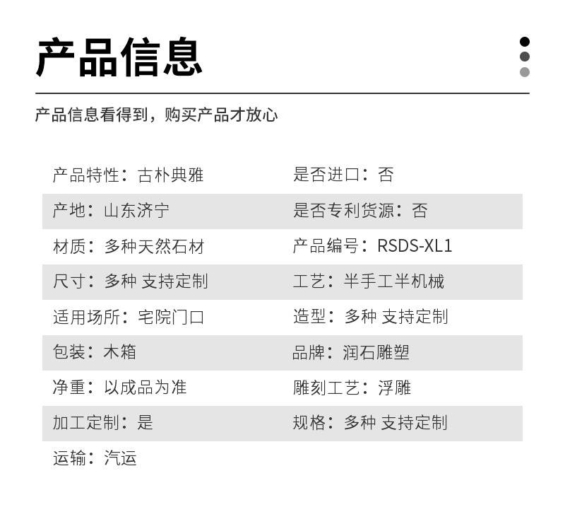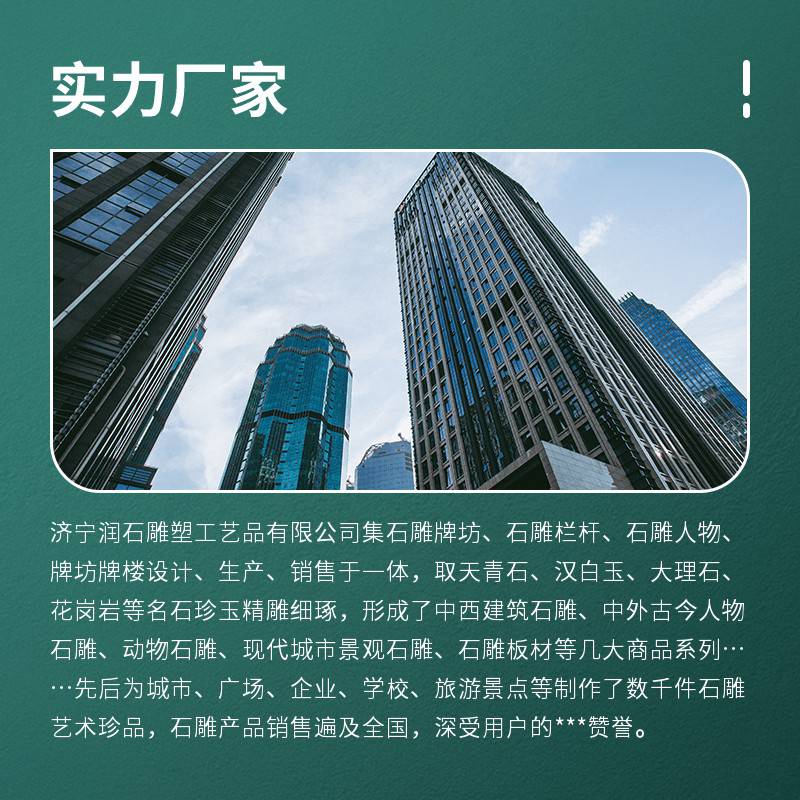 济宁润石雕塑工艺品有限公司集石雕牌坊、石雕栏杆、石雕人物、牌坊牌楼设计、生产、销售于一体,取天青石、汉白玉、大理石、花岗岩等名石珍玉精雕细琢,形成了中西建筑石雕、中外古今人物石雕、动物石雕、现代城市景观石雕、石雕板材等几大商品系列……先后为城市、广场、企业、学校、旅游景点等制作了数千件石雕艺术珍品,石雕产品销售遍及全国,深受用户的***赞誉。 产品系列有: 石雕牌坊系列:乡村入口牌坊、村口牌楼、石牌楼、石牌坊、贞洁牌坊、忠孝牌坊、墓地牌坊、景区牌坊、寺庙牌坊等。 石栏杆系列:各种石材石栏杆、石栏板、石护栏、桥栏杆、河道护栏、景区护栏、别墅栏杆等。 石雕壁画系列:花鸟鱼虫浮雕壁画、庭院照壁、九龙壁石雕、地雕、御道等。 石雕石亭系列:石雕亭子、仿古亭子、欧式亭子、龙柱亭子、石亭子等。 石雕兽类系列:石狮子、石牛、石雕马、石龟、十二生肖石雕、石雕麒麟、石雕貔貅、石雕大象等。 石雕人物系列:石雕孔子像、主席像等各种名人像、伟人像、古人雕像。 园林石雕系列:石雕鱼缸、石桌石凳、石雕花钵、石雕龙柱、柱墩、抱鼓石、石雕龙柱、文化柱等。 石材加工系列:各种加工面青石板、黄锈石、老石板、路边石、台阶石、垒墙石、护坡石、外墙干挂石等。