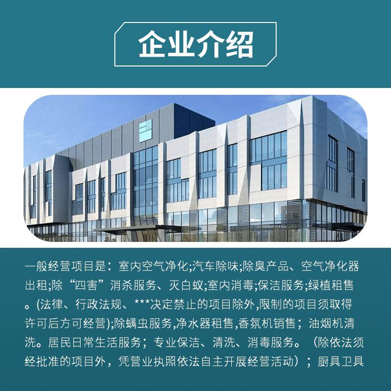 | 经营范围 | 一般经营项目是:空气检测;室内空气净化;除甲醛;除醛产品的研发与销售;汽车除味;除臭产品、空气净化器出租;除“四害”消杀服务、灭白蚁;室内消毒;保洁服务;绿植租售。(法律、行政法规、国务院决定禁止的项目除外,限制的项目须取得许可后方可经营);除螨虫服务,净水器租售,香氛机销售;油烟机清洗。居民日常生活服务;专业保洁、清洗、消毒服务。(除依法须经批准的项目外,凭营业执照依法自主开展经营活动);厨具卫具及日用杂品批发;林业有害生物防治服务;建筑物清洁服务;装卸搬运;家政服务。(除依法须经批准的项目外,凭营业执照依法自主开展经营活动),许可经营项目是:气体、液体分离及纯净设备制造;普通货物仓储服务(不含危险化学品等需许可审批的项目);建筑用石加工。 | ||