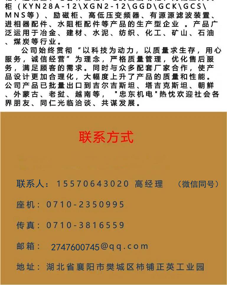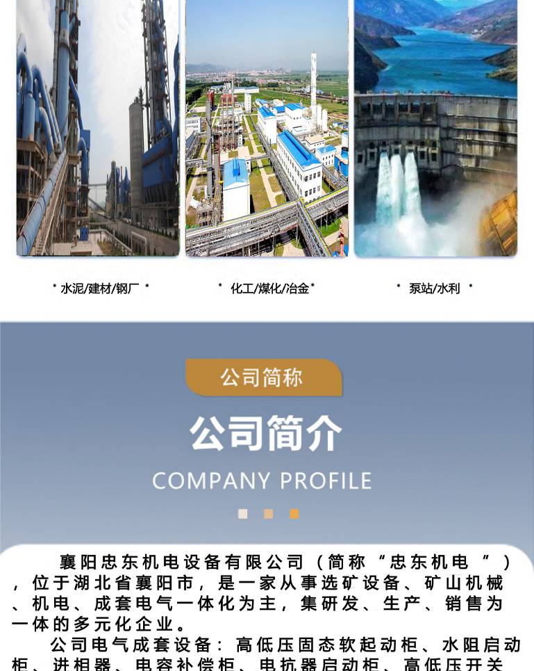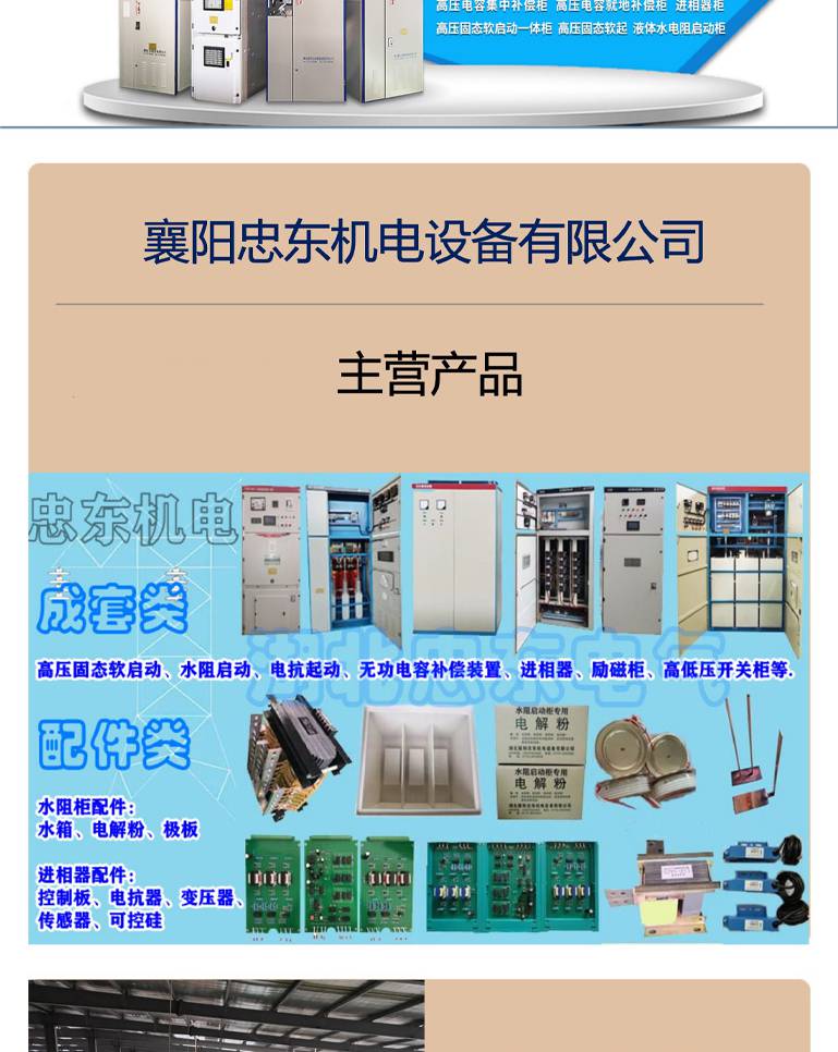 襄阳忠东机电设备有限公司(简称“忠东机电 ”),位于湖北省襄阳市,是一家专业从事高压电机软启动、高压无功电容补偿柜、高压成套电气、自动化系统 、电力工程等为主的集研发、生产、销售为一体的高新技术企业,公司通过***质量体系认证,拥有多项实用新型***、发明***、软著等知识产权。 公司电气成套设备:高低压固态软起动柜、液阻启动柜、电抗器启动柜、高压自耦降压启动柜、进相器、电容补偿柜、同步电机励磁柜、高低压开关柜、直流屏、有源源滤波装置、各类配件等产品的生产企业 。产品广泛运用于冶金、建材、水泥、纺织、化工、矿山、石油、煤炭、市政等行业。 公司始终***“以科技为动力,以质量求生存,用心服务,诚信经营”为理念,严格质量管理,优化售后服务,满足顾客的需求。同时与众多配套厂家合作,使产品设计更加合理化,大幅度上升了产品的质量和性能。公司产品已批量出口到吉尔吉斯坦、塔吉克斯坦、朝鲜、外蒙古、老挝、越南、俄罗斯、乌兹别克斯坦、刚果、马来西亚等。 "忠东机电"热忱欢迎社会各界朋友、同仁光临洽谈、共谋发展。 企业宗旨: 用户至上,信誉取胜。 经营理念: 靠员工管理企业,靠科技提高素质, 靠质量赢得市场,靠创新促进发展。 企业作风: 实干,文明,拼搏,求真、务实,勤奋。 企业精神: 爱厂,敬业,***,进取,尽职,尽责,拼搏,创新。 企业形象: 依法经营,管理科学,从业文明,作风过硬,勇于创新。 企业信念: 走创业之路,谋发展大计。 企业哲学: 管理以人为本,服务以质为先。