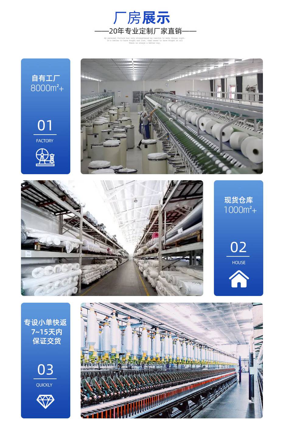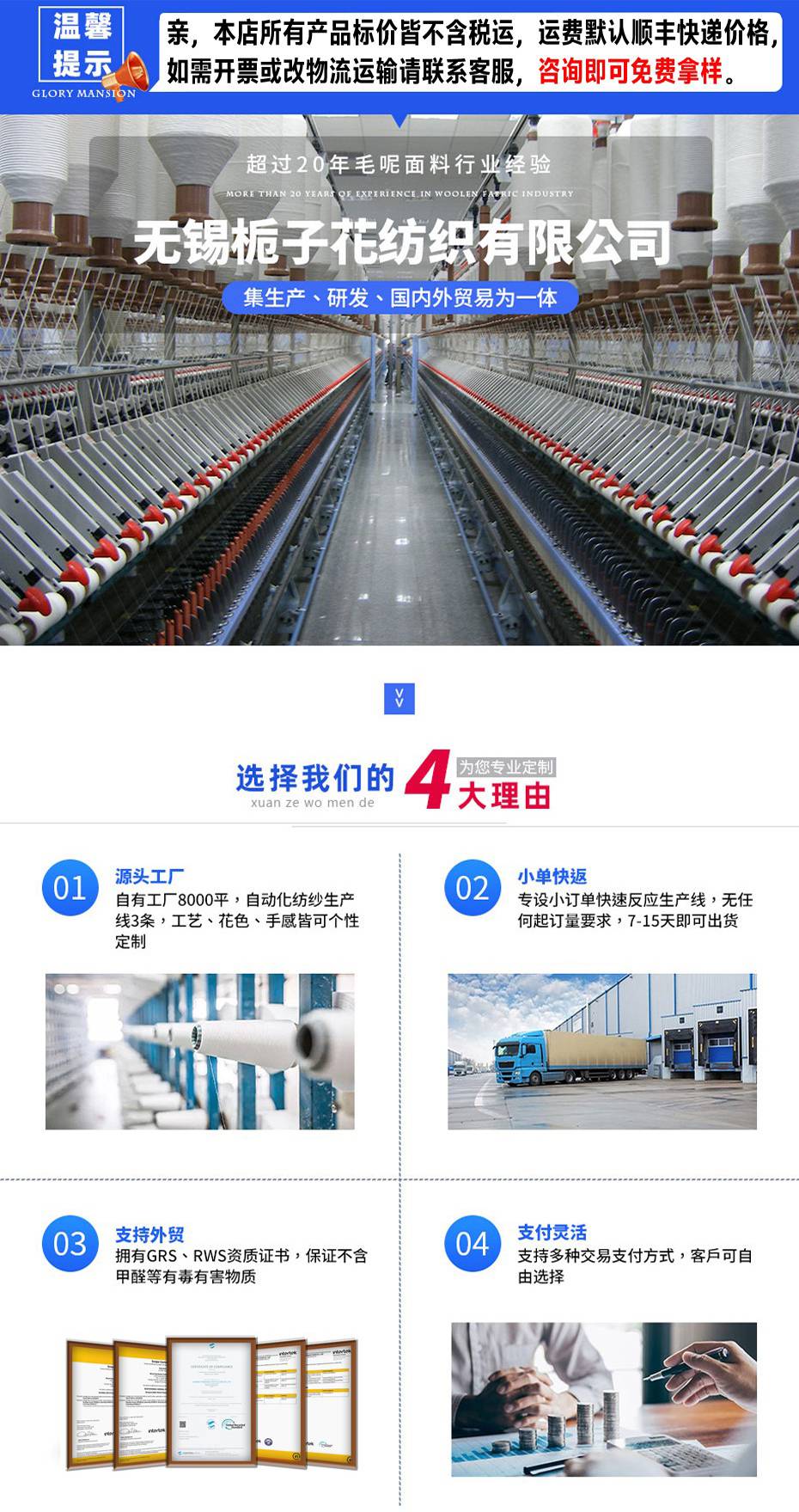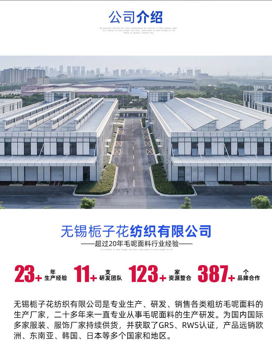 无锡栀子花纺织有限公司是专业生产、研发、销售毛呢面料的厂家,二十多年来一直专注于秋冬大衣面料。主要产品类型有双面呢、顺毛呢、法兰呢、麦尔登呢、羊绒呢、阿尔巴卡毛呢等。 我们生产的全部面料产品皆通过全球再生标准(GRS)和责任羊毛标准(RWS)认证,面料成分可出具第三方机构的检测报告,***真材实料。可生产美标US和欧标IOS产品,支持跨境外贸,为国际国内多家知名服装、面料品牌商家持续供货超20年,产品远销欧美、中东、日韩、东南亚等多个国家和地区。 自有厂房8000㎡,拥有全进口纺纱生产线3条、高速数字智能化织布机70台,另有定向合作整理厂超10家,***反应快速。我们还专设小单快返生产线,面料的工艺、成分、花色、克重等参数皆可个性化定制,3米起订、7天打样、15天交货。同时常备100万米以上的各类面料坯布,***大货交期不超过30天。 我们还整合了上百家同行工厂资源,自有1000㎡的现货展厅内存有上万种不同款式的面料,统一使用***软件系统管理货源。方便客户快速找款,并及时获取所需的现货面料。 公司旗下有一支独立的面料研发团队,由一名拥有30年毛呢面料研发经验的总监带领,其他专业院校出身设计师12名。我们能快速、敏感地掌握毛呢面料市场流行趋势,帮助客户的产品快速完成转型升级,每年可开发500组以上的时尚新品,现在咨询客服即可领取当季新款样布。