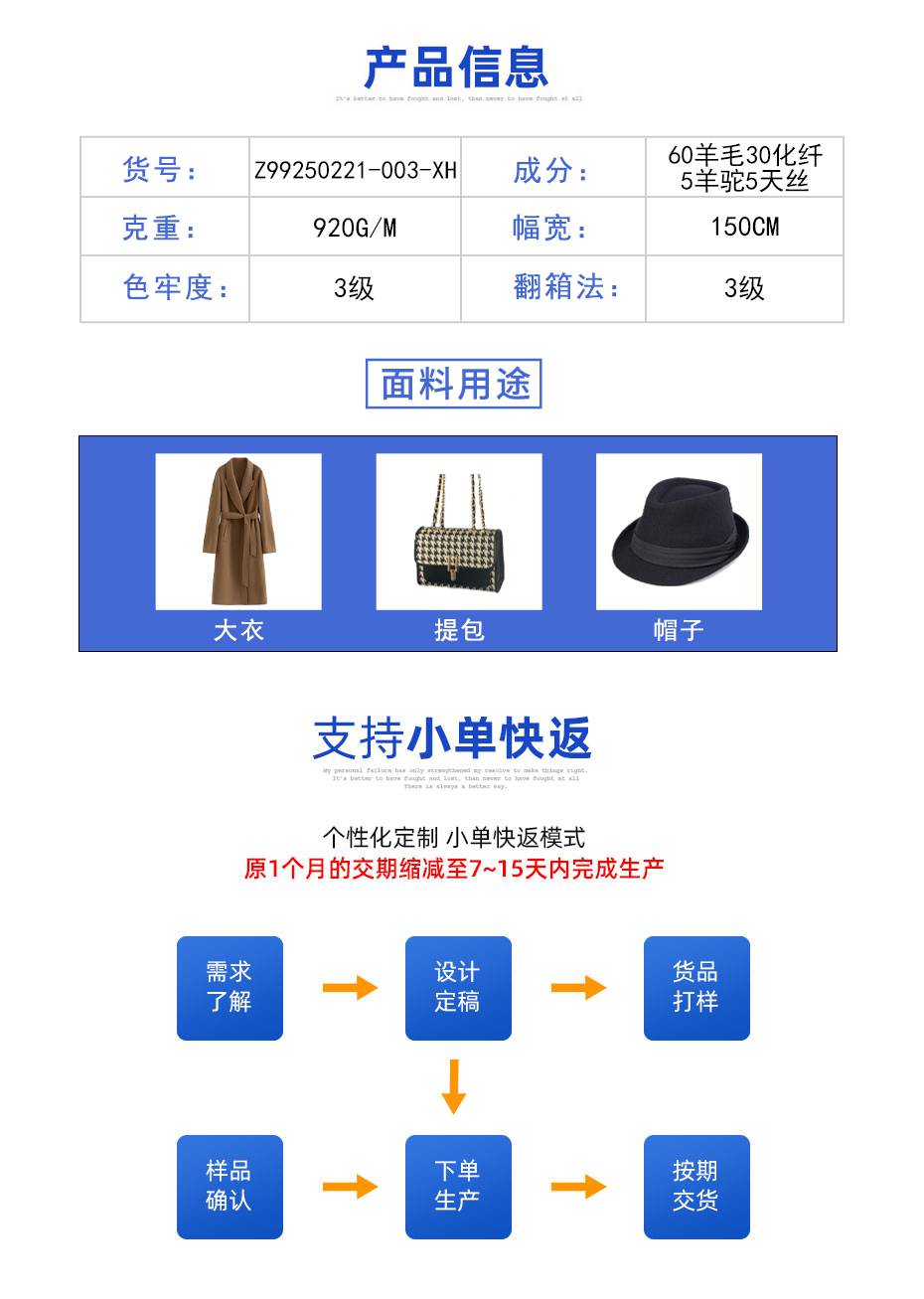 | 产品特性:阿尔巴卡 | 品种:大衣呢 | 成分及含量:60%羊毛 30%化纤 5%羊驼 5%天丝 |