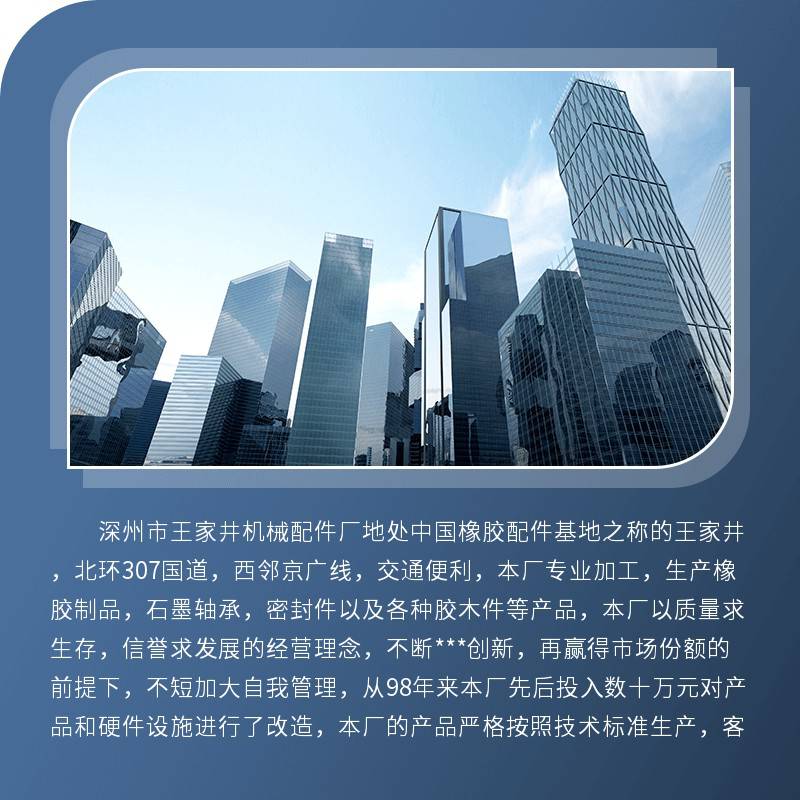 深州市王家井机械配件厂地处中国橡胶配件基地之称的王家井,北环307国道,西邻京广线,交通便利,本厂专业加工,生产橡胶制品,石墨轴承,密封件以及各种胶木件等产品,本厂以质量求生存,信誉求发展的经营理念,不断***创新,再赢得市场份额的前提下,不短加大自我管理,从98年来本厂先后投入数十万元对产品和硬件设施进行了改造,本厂的产品严格按照国家技术标准生产,客户遍布全国各地,并与国内数家知名企业建力了OEM长期合作关系,在市场变化日新月异的今天我们愿同广大客户,代理同盟同呼吁共命运,不短加深合作,取得更大的共赢。 我厂产品广泛用于各种机械设备,机械密封,制造机械等相关行业。本厂拥有专业的工程技术人员,依靠过硬的产品质量,优质的服务和合理的价格赢得的广大客户的认可和赞誉。同时,我们还与专业院校合作聘请经验丰富的专家,亲临生产现场进行技术指导,降低产品成本,提高产品质量,使产品的各种指标完全符合客户的要求。