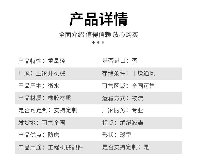 本页信息为深州市王家井机械配件厂为您提供的"王家井球型缓冲垫 减震防滑抗磨损橡胶垫 加工定制"产品信息,如您想了解更多关于"王家井球型缓冲垫 减震防滑抗磨损橡胶垫 加工定制"价格、型号、厂家请联系厂家,或给厂家留言。 进入店铺