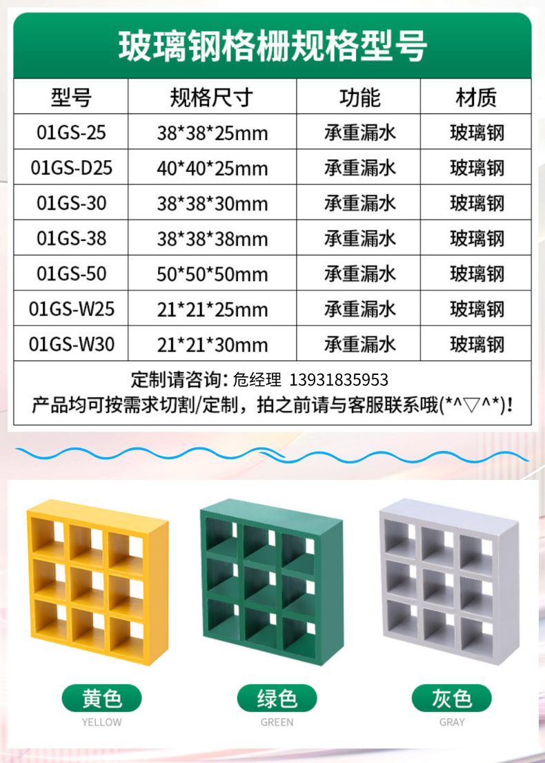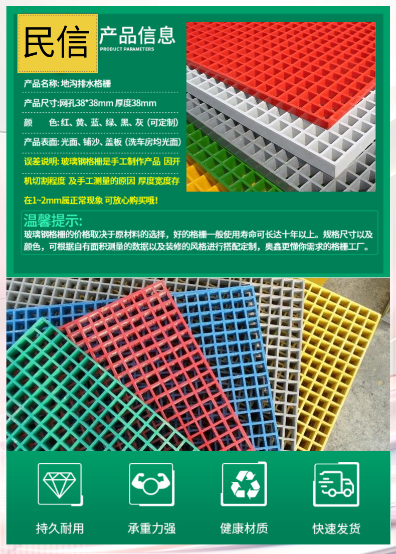 本页信息为河北民信复合材料制品有限公司为您提供的"玻璃钢格栅洗车房塑料拼接格栅板树坑格栅颜色黄色 绿色可定制"产品信息,如您想了解更多关于"玻璃钢格栅洗车房塑料拼接格栅板树坑格栅颜色黄色 绿色可定制"价格、型号、厂家请联系厂家,或给厂家留言。 进入店铺