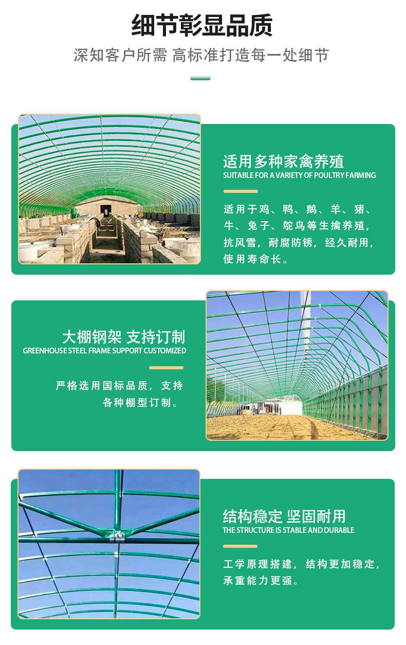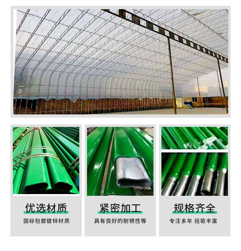 | 镀锌层:150克/平米mm | 覆盖层:棚膜保温被 | 规格:8-12米开跨 |