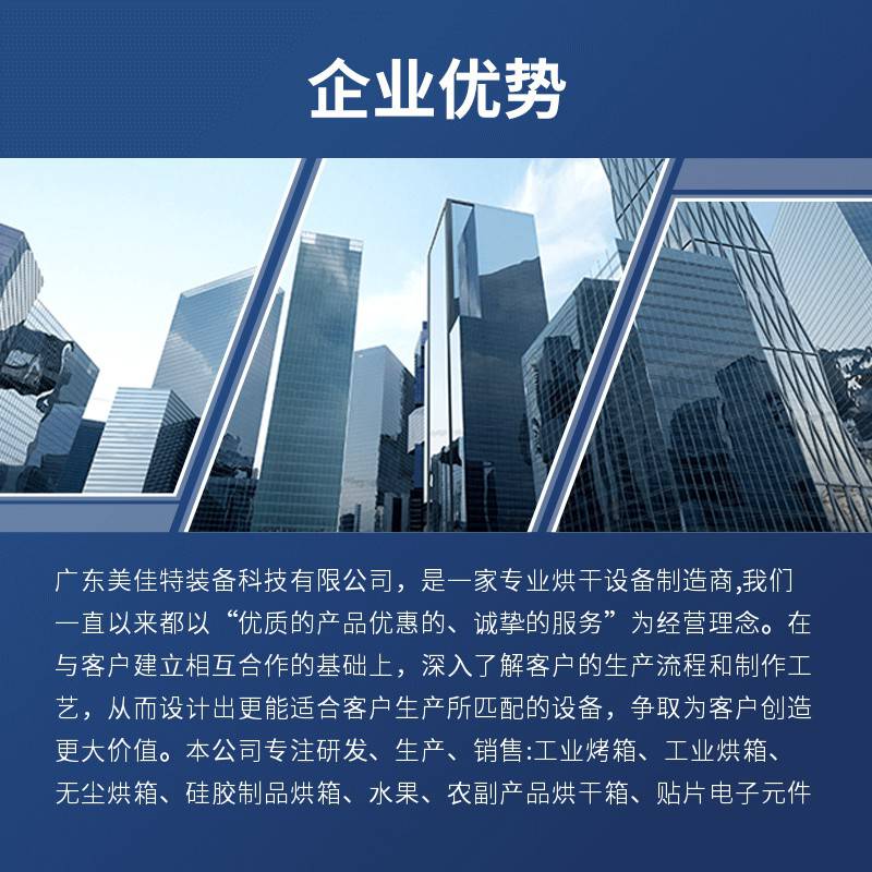 广东美佳特装备科技有限公司,是一家专业烘干设备制造商,我们一直以来都以“优质的产品优惠的价格、诚挚的服务”为经营理念。在与客户建立相互合作的基础上,深入了解客户的生产流程和制作工艺,从而设计出更能适合客户生产所匹配的设备,争取为客户创造更大价值。本公司专注研发、生产、销售:工业烤箱、工业烘箱、无尘烘箱、硅胶制品烘箱、水果、农副产品烘干箱、贴片电子元件精密排胶炉、LED光电烤箱、铝电池专用烤箱、美耐皿制品烤箱高温炉、高温气氛隧道炉、红外线IR隧道炉,UV固化机、五金制品电镀烤漆房等设备。“立足客户,服务客户”是公司秉承的宗旨,为了更好地适顺应市场需求,我们已在管理和工艺上形成了持续创新的发展模式,生产的产品具有灵活性及实用性。欢迎各界朋友莅临参观、指导及业务洽谈。选择我们,请您们放心!