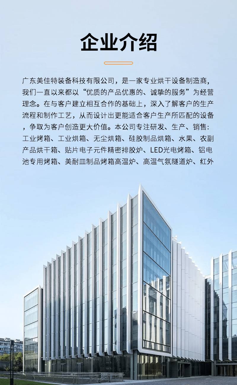广东美佳特装备科技有限公司,是一家专业烘干设备制造商,我们一直以来都以“优质的产品优惠的价格、诚挚的服务”为经营理念。在与客户建立相互合作的基础上,深入了解客户的生产流程和制作工艺,从而设计出更能适合客户生产所匹配的设备,争取为客户创造更大价值。本公司专注研发、生产、销售:工业烤箱、工业烘箱、无尘烘箱、硅胶制品烘箱、水果、农副产品烘干箱、贴片电子元件精密排胶炉、LED光电烤箱、铝电池专用烤箱、美耐皿制品烤箱高温炉、高温气氛隧道炉、红外线IR隧道炉,UV固化机、五金制品电镀烤漆房等设备。“立足客户,服务客户”是公司秉承的宗旨,为了更好地适顺应市场需求,我们已在管理和工艺上形成了持续创新的发展模式,生产的产品具有灵活性及实用性。欢迎各界朋友莅临参观、指导及业务洽谈。选择我们,请您们放心!