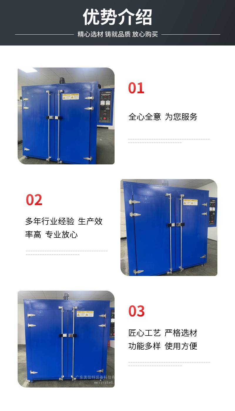 广东美佳特装备科技有限公司,是一家专业烘干设备制造商,我们一直以来都以“优质的产品优惠的价格、诚挚的服务”为经营理念。在与客户建立相互合作的基础上,深入了解客户的生产流程和制作工艺,从而设计出更能适合客户生产所匹配的设备,争取为客户创造更大价值。本公司专注研发、生产、销售:工业烤箱、工业烘箱、无尘烘箱、硅胶制品烘箱、水果、农副产品烘干箱、贴片电子元件精密排胶炉、LED光电烤箱、铝电池专用烤箱、美耐皿制品烤箱高温炉、高温气氛隧道炉、红外线IR隧道炉,UV固化机、五金制品电镀烤漆房等设备。“立足客户,服务客户”是公司秉承的宗旨,为了更好地适顺应市场需求,我们已在管理和工艺上形成了持续创新的发展模式,生产的产品具有灵活性及实用性。欢迎各界朋友莅临参观、指导及业务洽谈。选择我们,请您们放心!