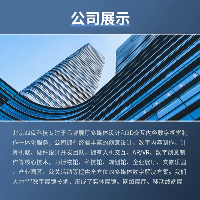 北京四度科技专注于品牌展厅多媒体设计和3D交互内容数字视觉制作一体化服务,公司拥有经验丰富的创意设计、数字内容制作、计算机软、硬件设计开发团队,拥有人机交互、AR/VR、数字创意制作等核心技术,为博物馆、科技馆、规划馆、企业展厅、文旅乐园、产业园区、公关活动等提供全方位的多媒体数字解决方案。 我们大力***数字展馆技术,形成了实体展馆、网络展厅、移动终端展厅,博物馆、科技馆、城市规划馆、文化馆齐头并进的互动多媒体展厅建设新标准,在内容更加注重创意价值需要,用艺术的理念、创意的数字内容、创意的数字展示技术,精彩呈现项目的过去、现在和未来,有效传达项目的核心价值,超越客户的想象。 公司拥有***的管理体系以及掌握着前沿技术的开发人才和3D工程师组成的团队,产品均为定制研发,可根据用户实际需要定制,也可提供策划,拥有人机3D互动的成功案例。 北京四度科技有限公司自2014年成立以来,始终坚持如初,得益于紧抓用户需求,紧跟数字化进程,拥有人机交互、AR/VR、数字创意、3D可视化制作等核心技术,并成为中国数字孪生公司Top50名单,中国WEB3.0?(元宇宙)企业、并获得企业信用体系认证等奖项,在数字孪生、可视化、数字化改造及数字展厅项目中获得多个软著及***。 技术优势 拥有十年以上3D互动系统的行业经验、虚拟现实、3D交互开发经验,四度科技为学校、智慧城市、数据可视化中心、企业等大型场合提供三维互动开发与实施。? 售后服务 拥有售后服务体系,公司设有技术支持中心,对整个服务项目的实施过程提供快速便捷的支持,可长期免费为客户提供技术咨询等服务。 三维虚拟现实技术 三维虚拟现实技术是一种可以创建和体验虚拟世界的计算机仿真系统,利用计算机生成一种模拟环境,是一种多源信息融合的、交互式的三维动态视景和实体行为的系统仿真,并使用户沉浸到该环境中。应用领域有房地产、工业、园区及展厅等多个领域解决方案。